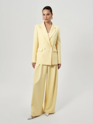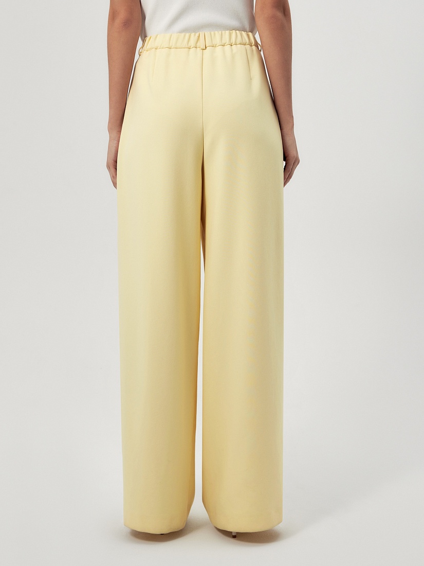 Широкие брюки со складками на приточном поясе из костюмной ткани молочного цвета со шлевками. Спереди боковые карманы и застежка на молнию и крючок, на спинке резинка в поясе для лучшей посадки брюк.