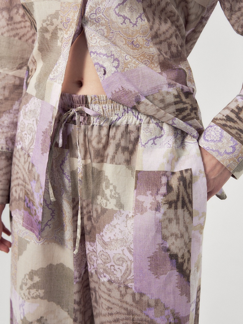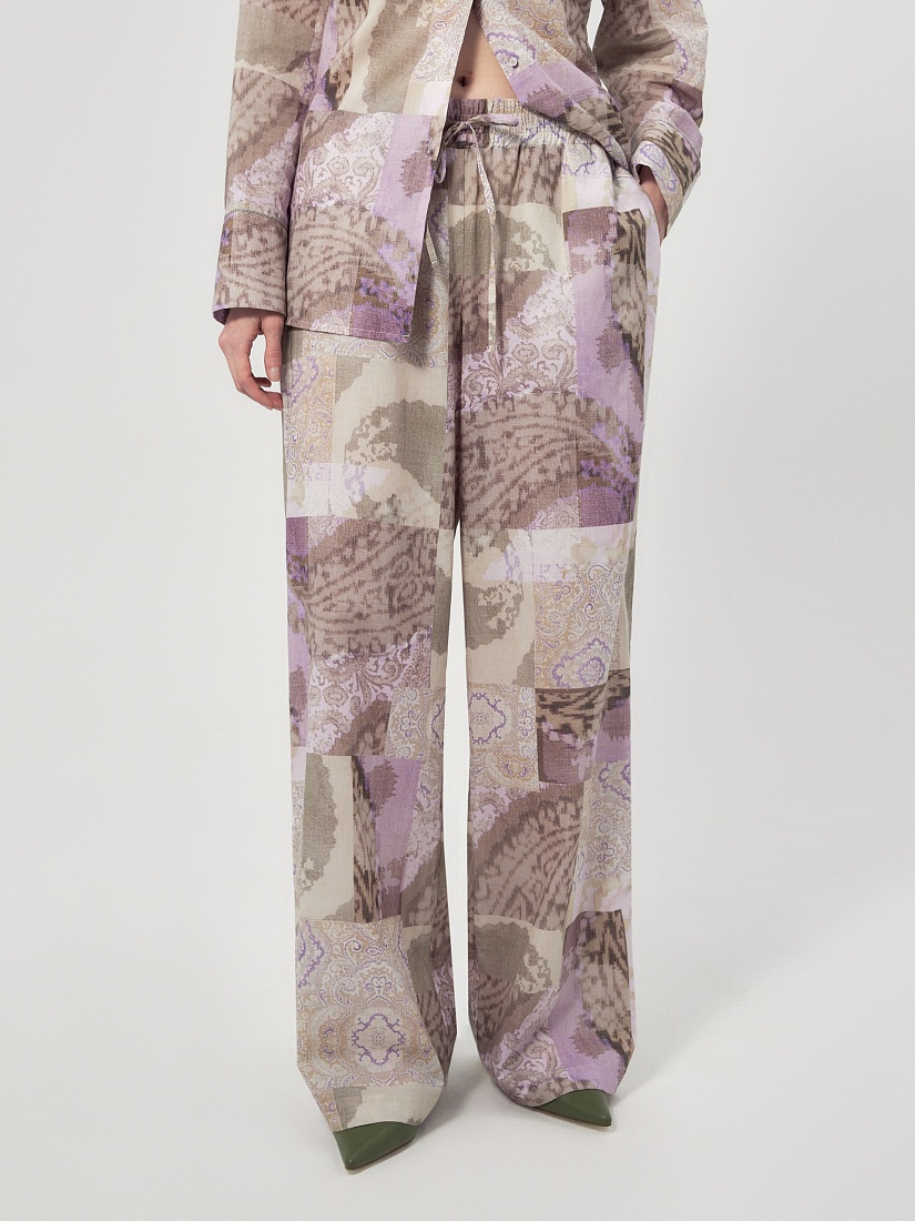 Брюки полной длины, из тонкой хлопковой ткани с этническим принтом в технике пэчворк, свободной формы, на поясе. В пояс вставлена резинка и кулиcка для лучшей фиксации.