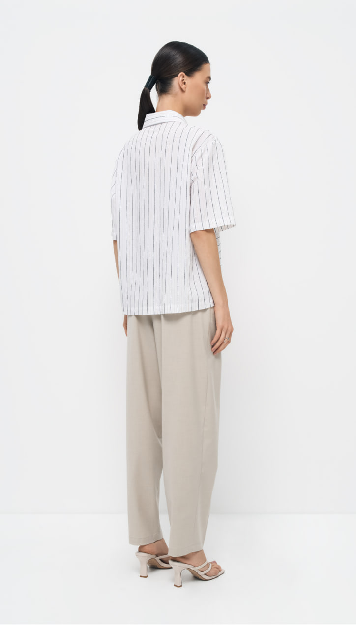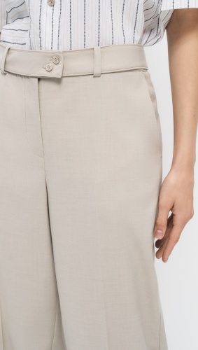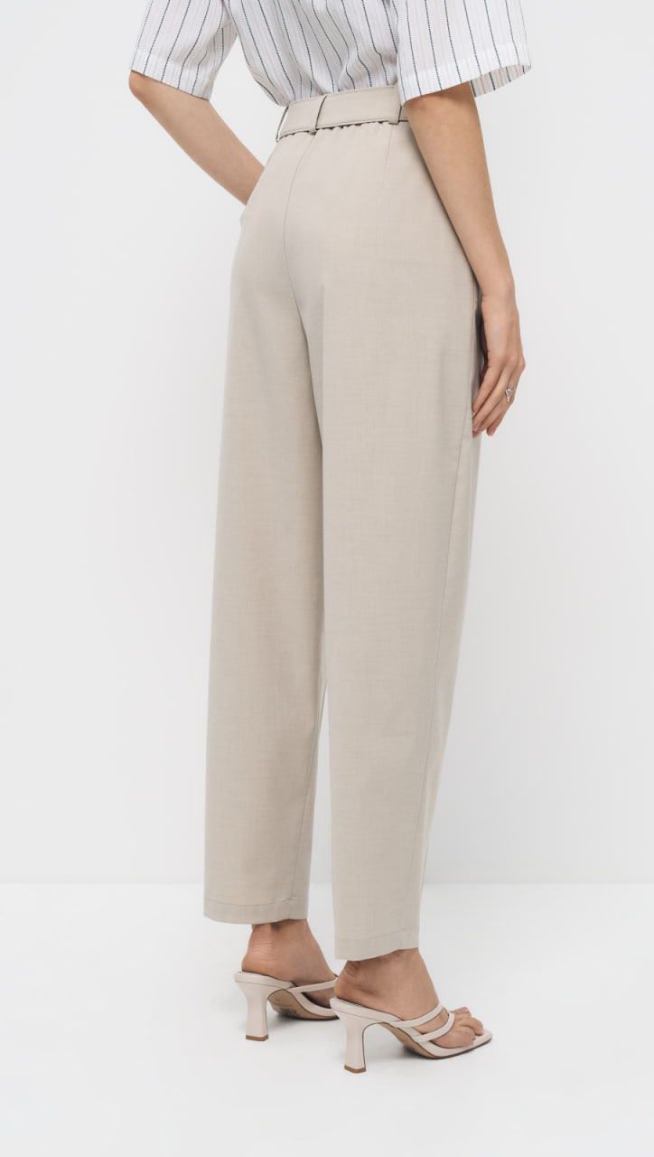 Брюки О-образного силуэта длиной 9/10 выполнены из летней вискозы со спандексом, обеспечивающим абсолютный комфорт за счет высокой эластичности. Цвет «белый сандал» придает изделию свежесть и легкость. Дополнительный съемный пояс со смещенной линией застежки добавляет изделию оригинальности, пуговицы на нем расположены в динамичном порядке, придавая брюкам уникальный стильный вид.