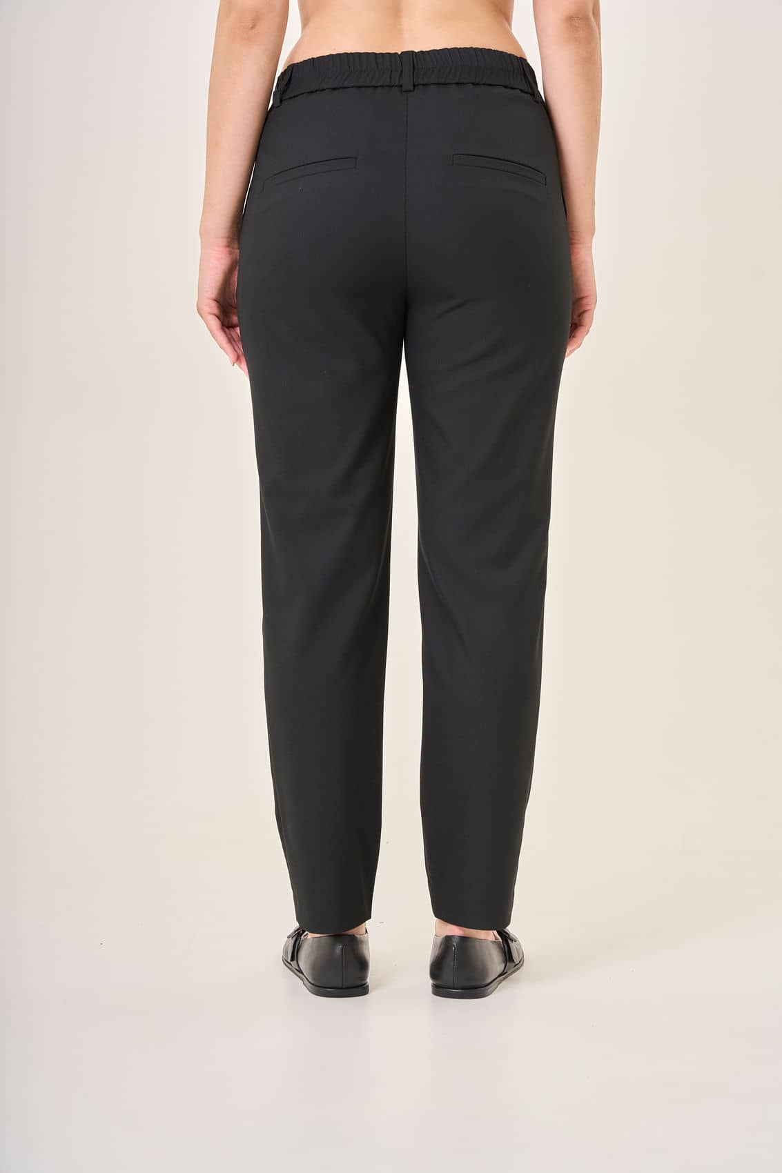 Женские классические брюки, слегка зауженные книзу. Комфортная посадка на талии и элегантный крой идеально подходят для офисного и повседневного гардероба. Сзади расположены два аккуратных накладных кармана, подчёркивающие классическую стилистику изделия. Плотная ткань сохраняет форму и выглядит презентабельно на любой фигуре.