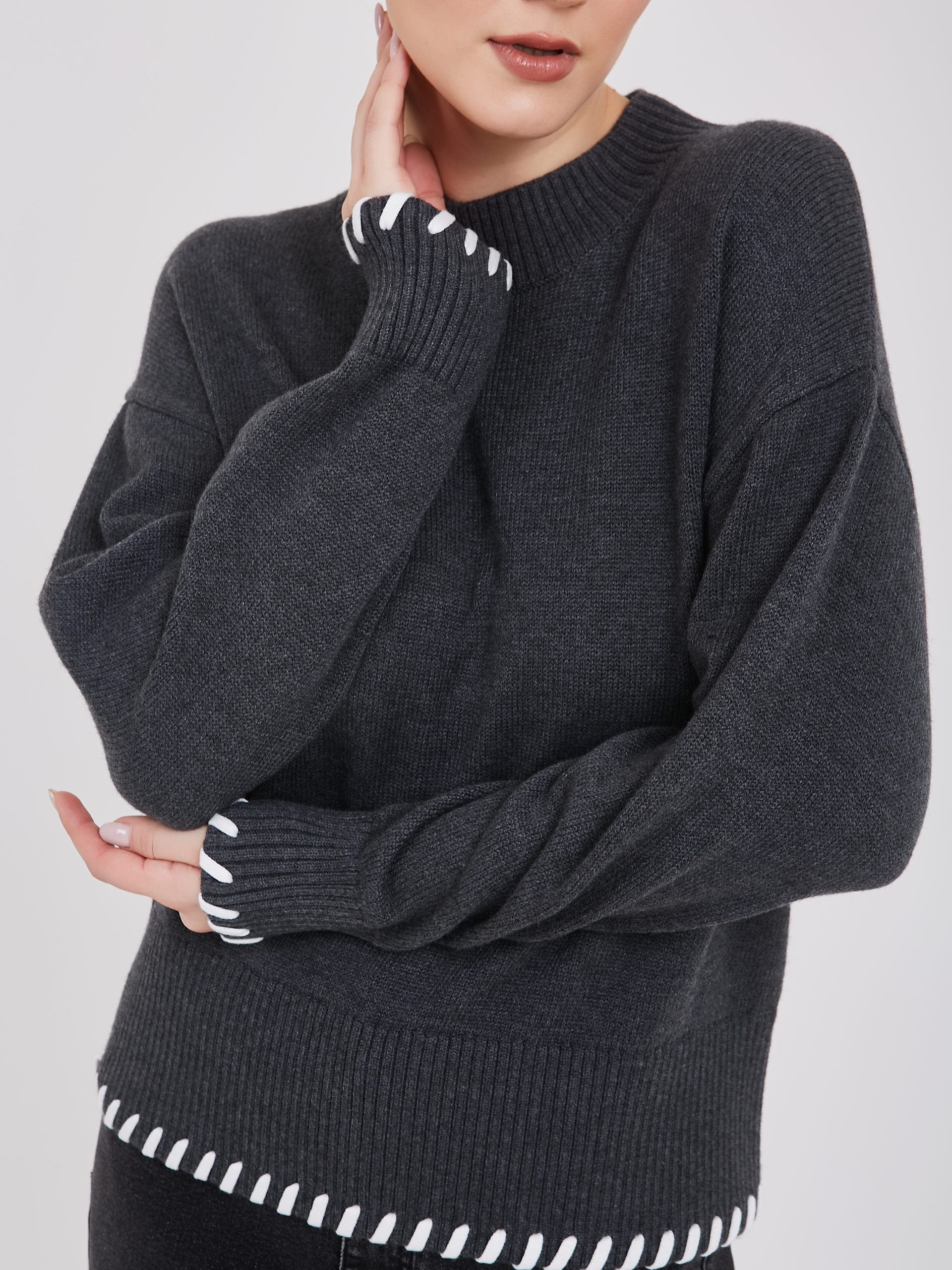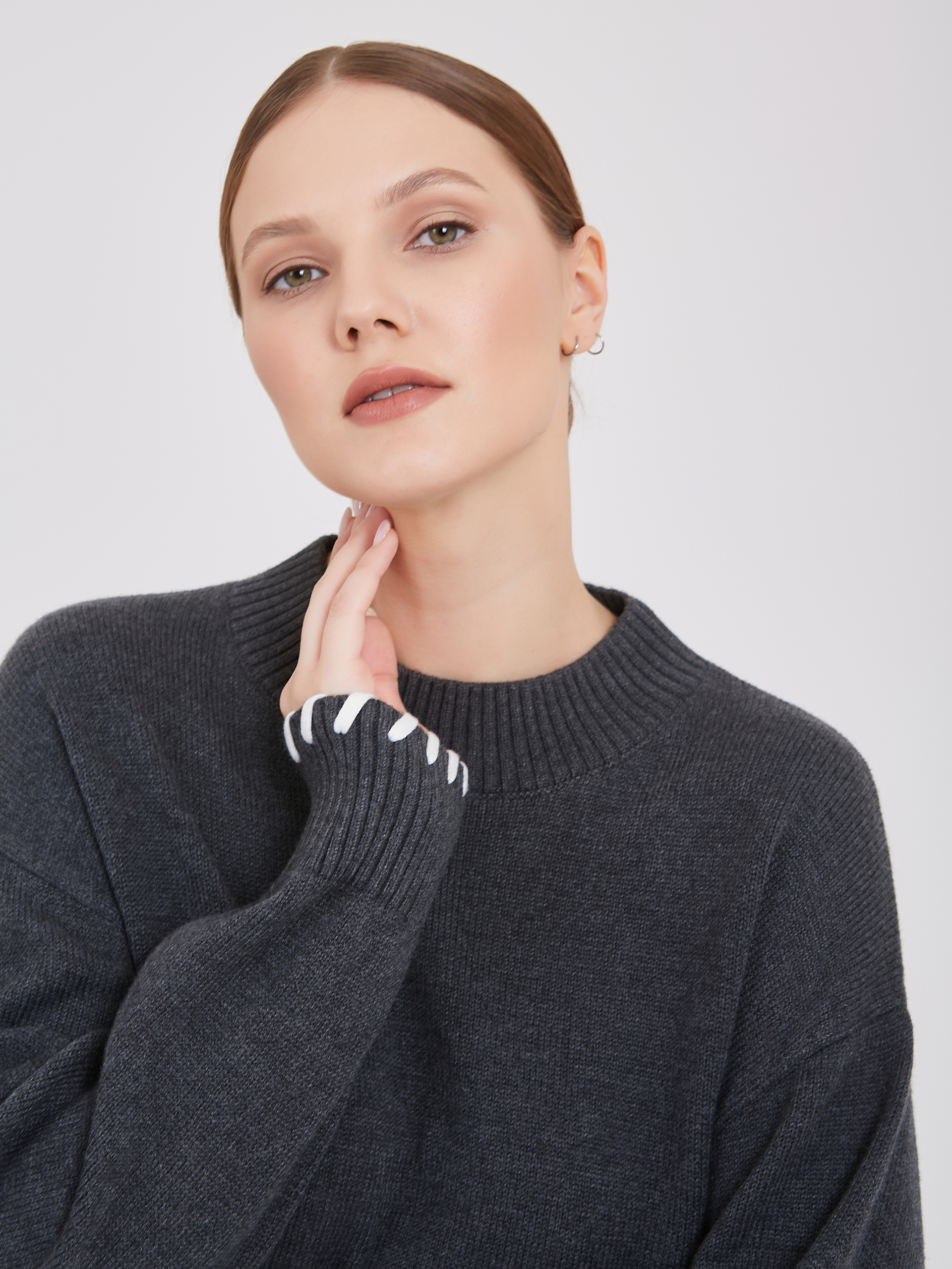 Женский темно-серый свитер свободного кроя. Длинные рукава и круглый вырез подчеркивают элегантность образа. Горизонтальные белые полосы на нижней части изделия и манжетах создают стильный акцент. Натуральный высококачественный материал приятен к телу и идеально подходит для прохладной погоды. Осень-Зима'25/26. Капсула "Вишневый сад"