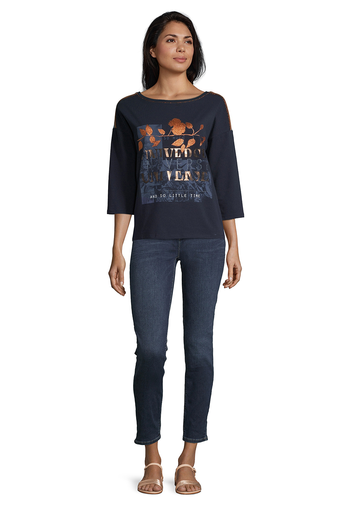 Джемпер с металлизированным принтом - яркий акцент вашего образа. Комфортный прямой покрой, горловины-лодочка, рукава 3/4 со спущенным плечом. Отделка горловины и рукавов с нитью люрекса придает роскошный блеск. Приятный эластичный материал из смеси хлопка и модала.
