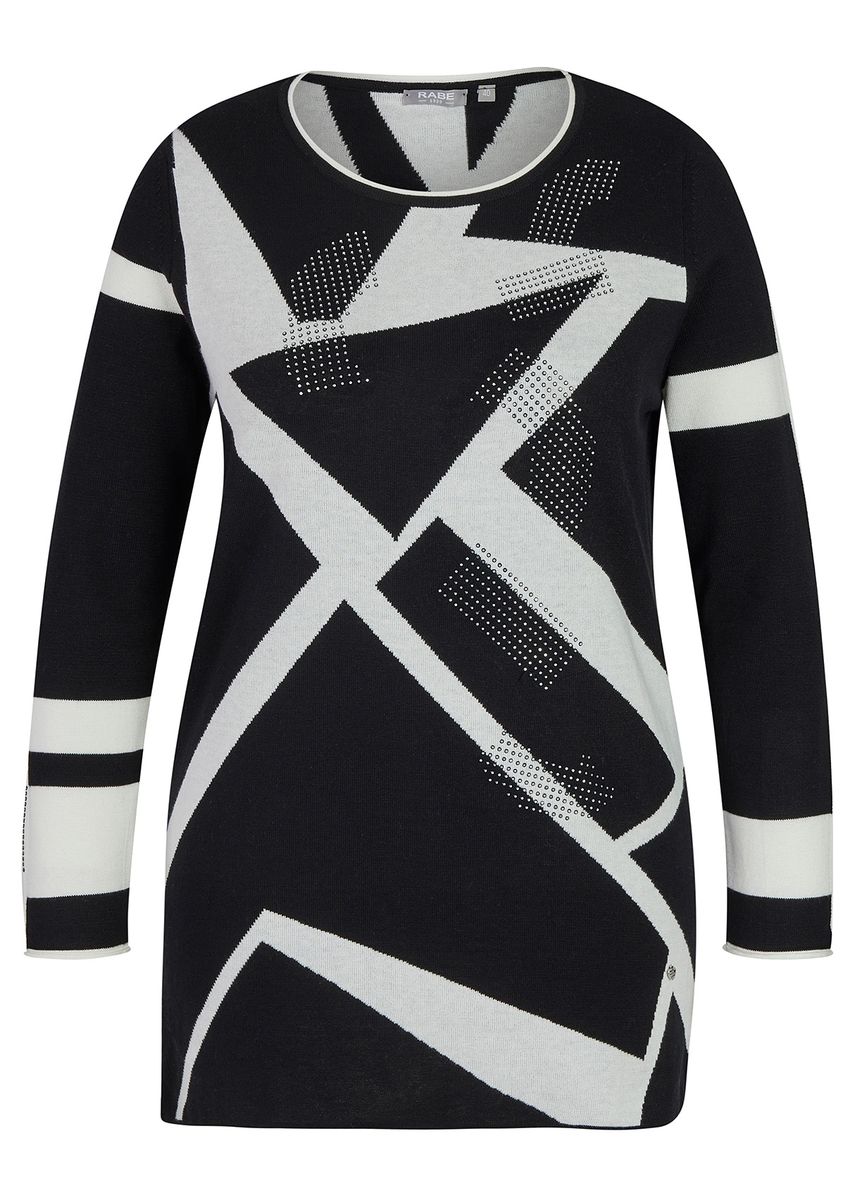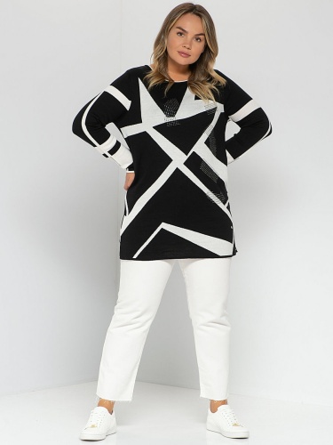 Удлиненный джемпер привлекает внимание своим контрастным геометрическим рисунком. Слегка приталенный силуэт, круглый вырез горловины, втачные рукава полной длины. Декор стразами создает более демократичный образ. Материал из хлопковой смеси приятен к телу и удобен в ношении.