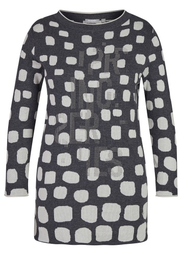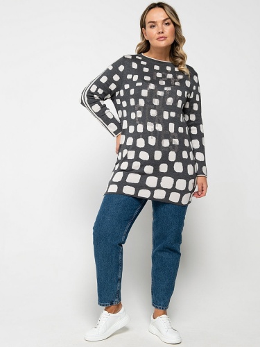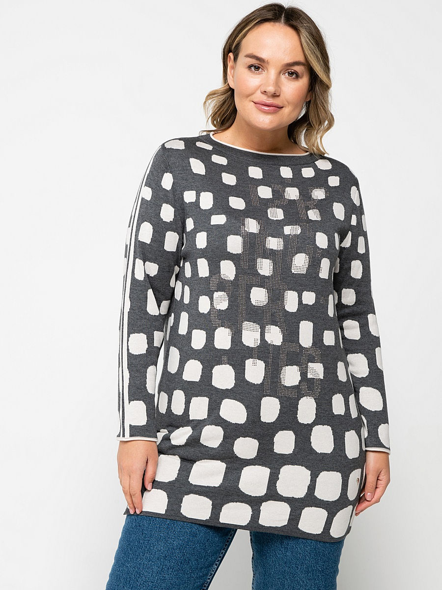 Удлиненный джемпер полуприлегающего силуэта. Вырез горловины "лодочка", втачные рукава полной длины. Абстрактный контрастный принт и декор стразами создают современный образ. Материал из хлопковой смеси приятен к телу и удобен в ношении.