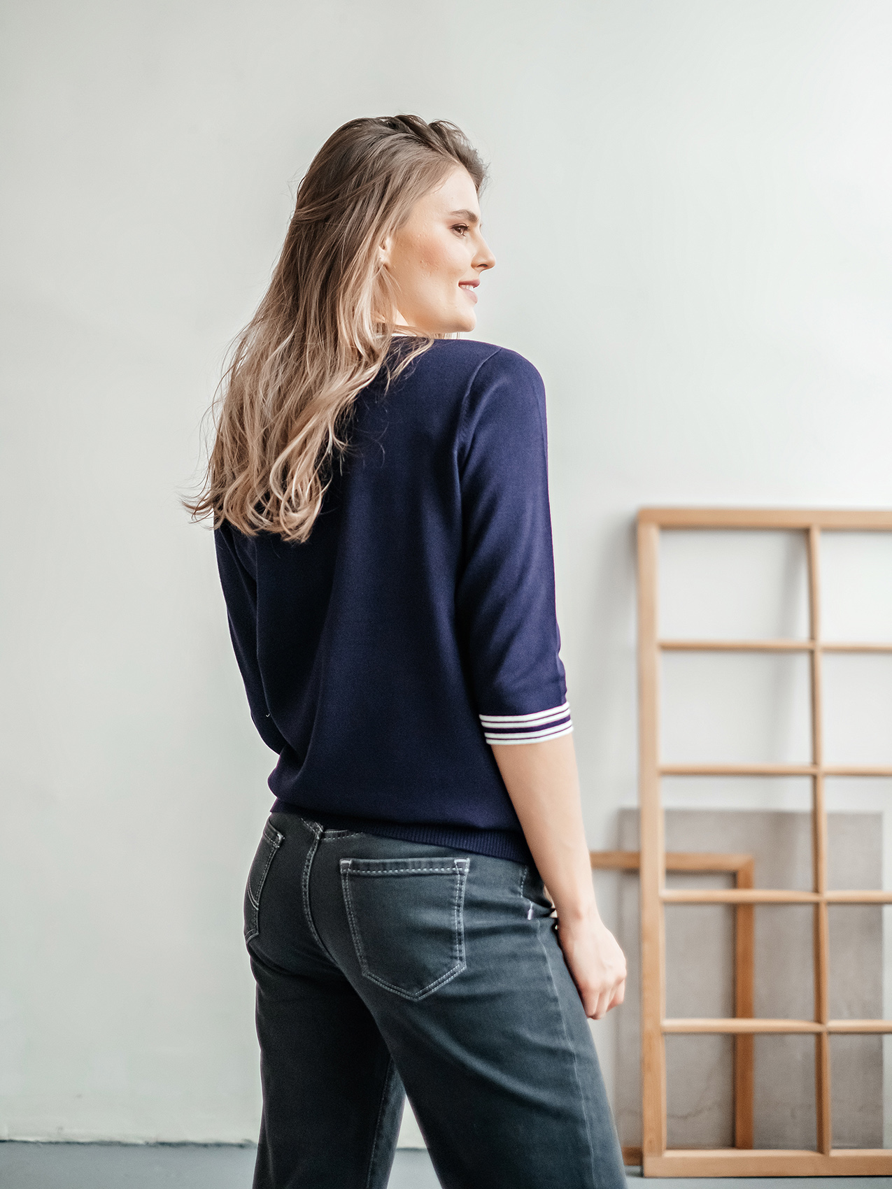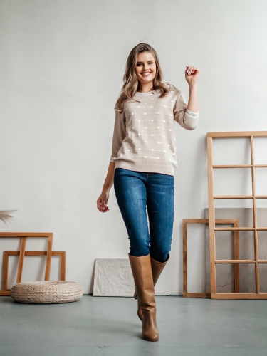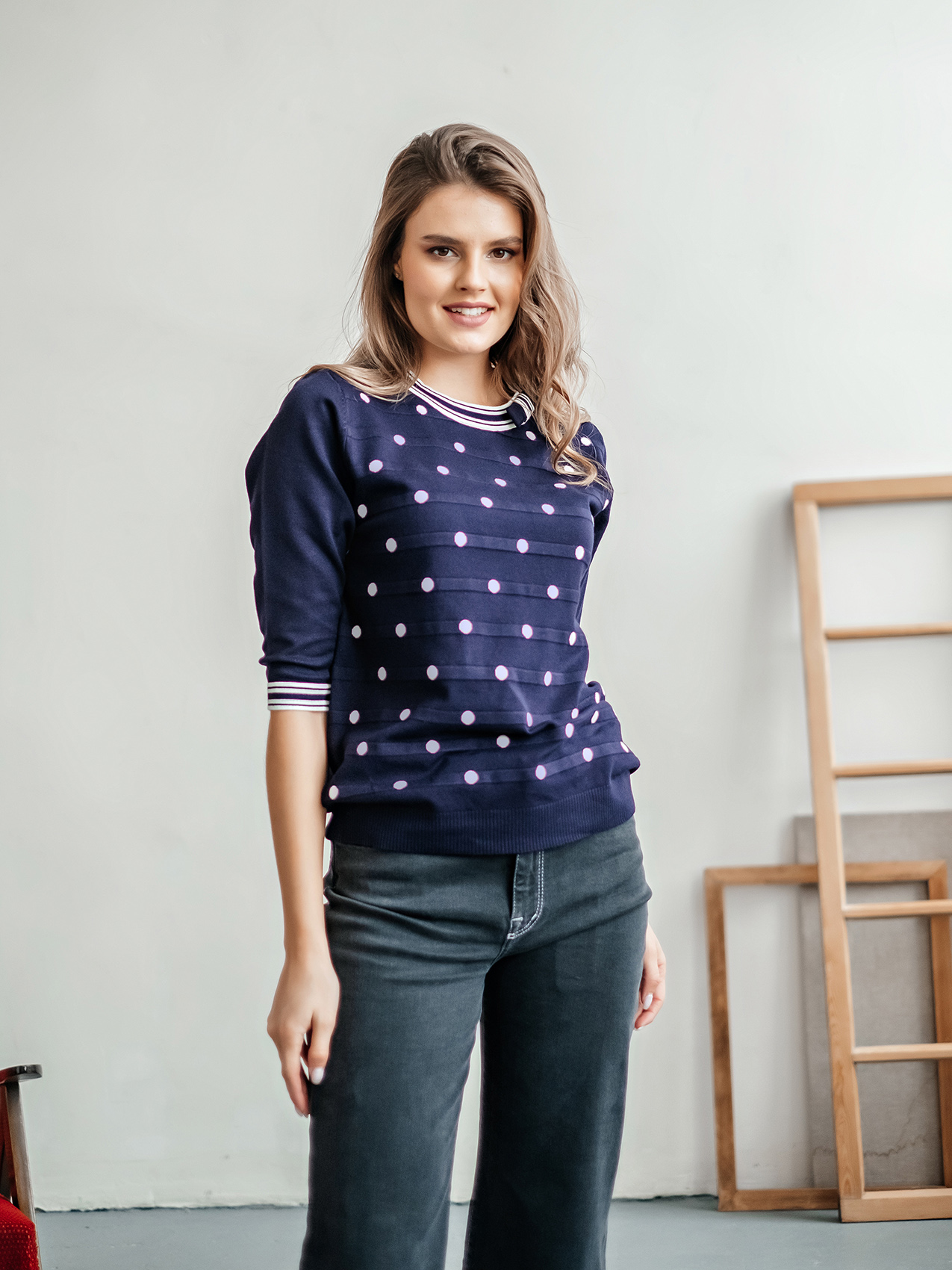 Теплый джемпер в горох - стильный вариант на каждый день. Свободный покрой, круглый вырез горловины и втачные рукава 3/4. Вырез оформлен декоративным элементом в виде банта. Приятный к телу материал из вискозной смеси обеспечивает комфорт.