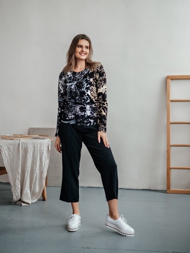 Теплый джемпер обращает на себя внимание благодаря цветочному принту в акварельном стиле. Прямой покрой, круглый вырез горловины, втачные рукава полной длины. Завершает изумительный дизайн декор из страз. Материал из вискозной смеси приятен к телу и обеспечивает комфорт.