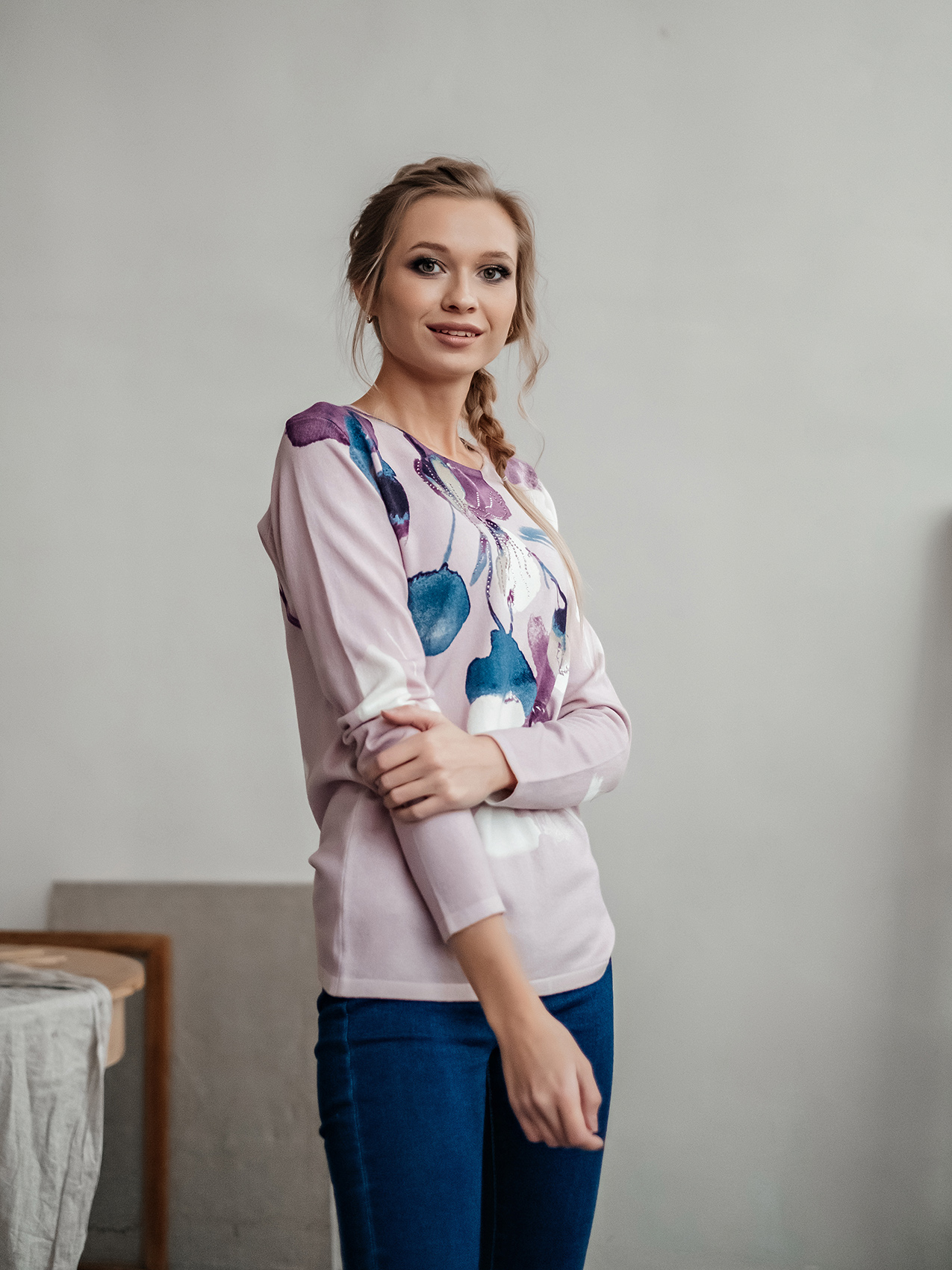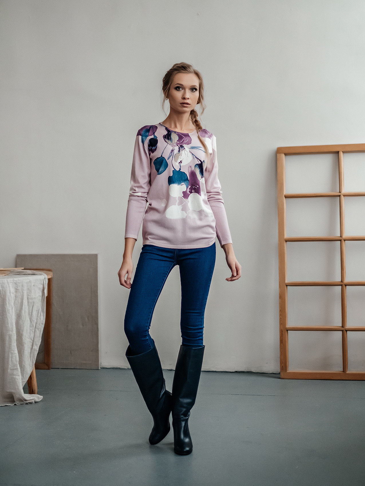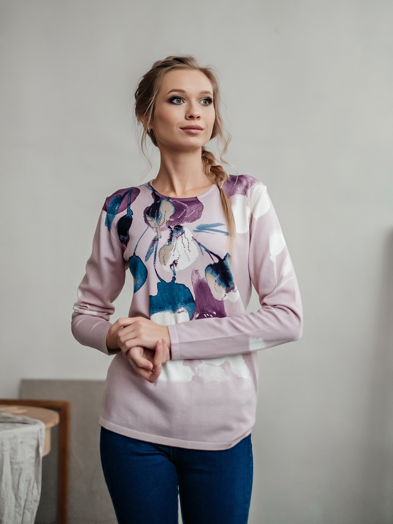 Теплый джемпер обращает на себя внимание благодаря цветочному принту в акварельном стиле. Прямой покрой, круглый вырез горловины, втачные рукава полной длины. Завершает изумительный дизайн декор стразами. Приятный к телу материал из смеси с вискозой и хлопком обеспечивает комфорт.