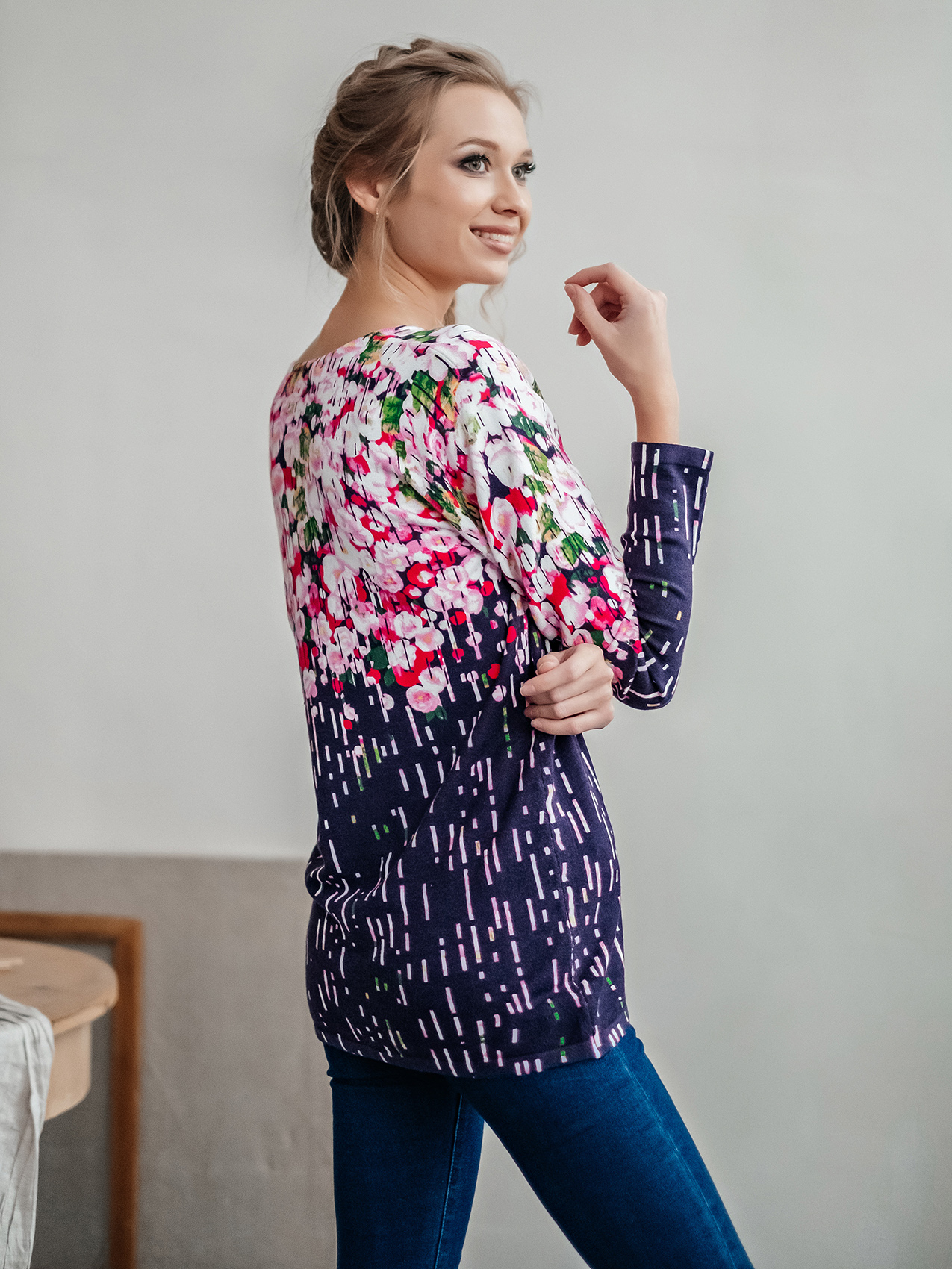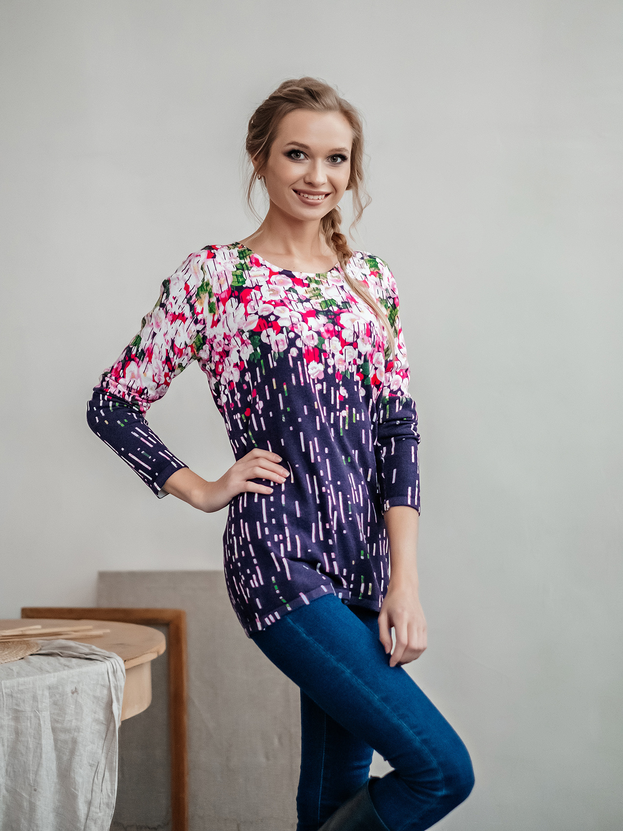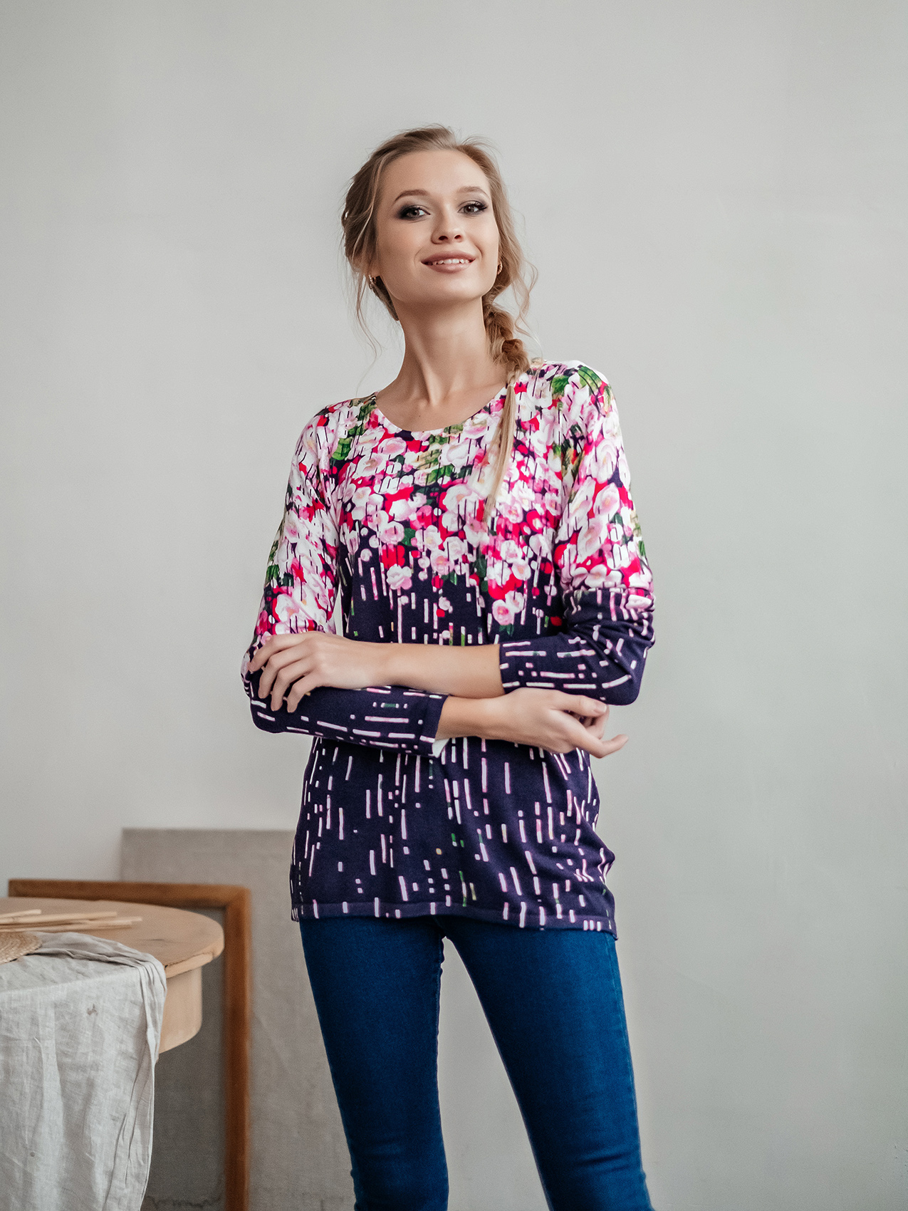 Позвольте себе быть яркой в этом джемпере с цветочным принтом! Джемпер свободного покроя, круглый вырез горловины, втачные рукава полной длины. Материал из вискозной смеси приятен к телу и обеспечивает комфорт.