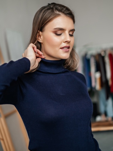На сайте указаны российские размеры Ткань: смесовая ткань средней плотности. В составе: 45% акрил, 32% тенсель, 23% шерсть. Крой: базовый однотонный джемпер приталенного силуэта в мелкий рубчик. Модель, напоминающая привычную водолазку, выделяется длинным воротом, который защищает от холода и ветра. Универсальная модель с шерстью в составе идеальный вариант для зимы и межсезонья. Джемпер представлен в трех стильных оттенках – сером, бежевом и темно-синем. Отделка: ткань в мелкий рубчик прекрасна в своей простоте. Базовый компаньон для джинсов, брюк, джемперов, сарафанов, юбок и рубашек.