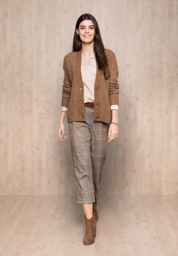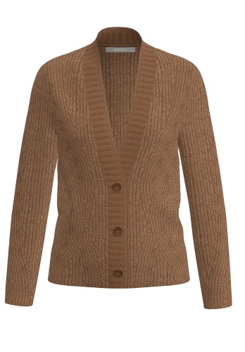 Вязаный кардиган - шикарная вещь для теплых осенне-зимних комплектов. Прямой покрой, v-образный вырез горловины, застежка на пуговицы, втачные рукава полной длины. Изысканный цвет грецкого ореха и фигурная машинная вязка завершают великолепный дизайн, универсальный и уместный по любому случаю.