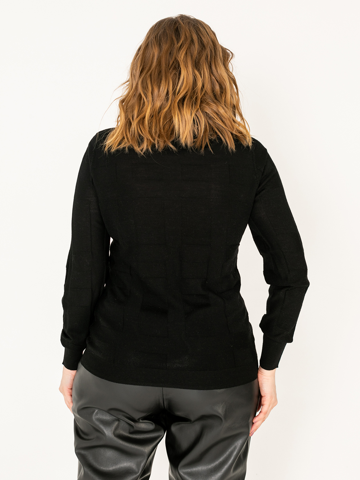 Однотонная водолазка – базовый элемент гардероба любой женщины. Геометрическая фактура задает динамику образу. Материал из натуральной шерсти. Втачной рукав полной длины, ворот-хомут.