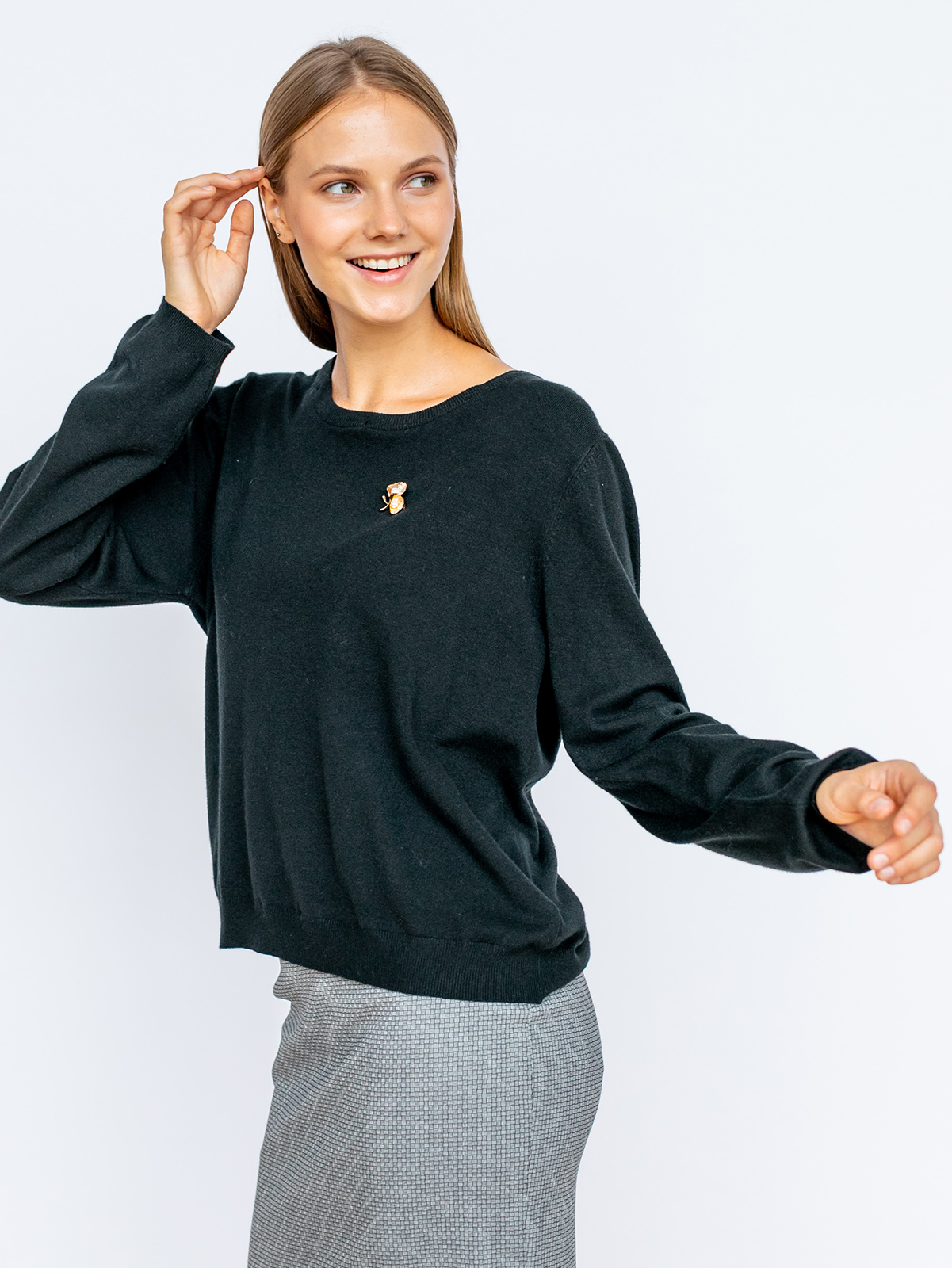 Джемпер с имитацией модели-двойки – элегантный вариант верха для образа в деловом стиле. Свободный крой подходит для фигур разного типа. Длинный втачной рукав с эластичной манжетой. Функциональный акцент в виде замка-молнии на спинке. Белый отложной воротничок декорирован стразами. Джемпер хорошо сочетается как с юбкой, так и с брюками.