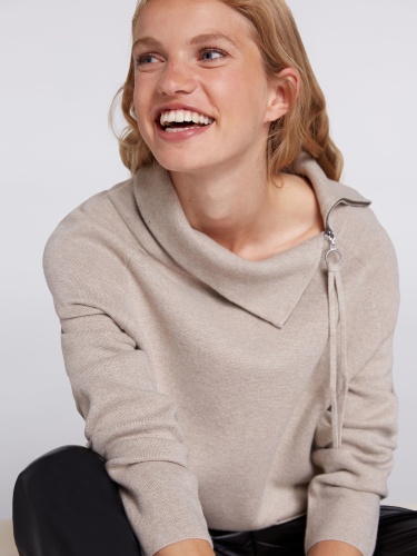Бежевый джемпер с воротником-стойкой на молнии. Прямой покрой, разрезы сбоку, удлиненная спинка изделия. Два накладных кармана спереди. Приятный трикотаж из смесового хлопка приятен к телу и обеспечивает комфортное ношение. Длина 60 см для размера 42. Рост модели 178 см, ее размер – 42 (российский).