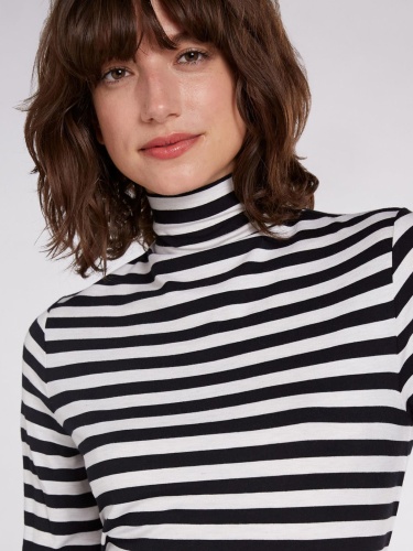 Базовая водолазка во французском стиле. Слегка приталенный силуэт, высокий воротник-гольф, втачные рукава полной длины. Водолазка может выступать как самостоятельный верх или надеваться под жакет, кардиган, блейзер или сарафан. Рост модели 178 см, ее размер – 42 (российский).