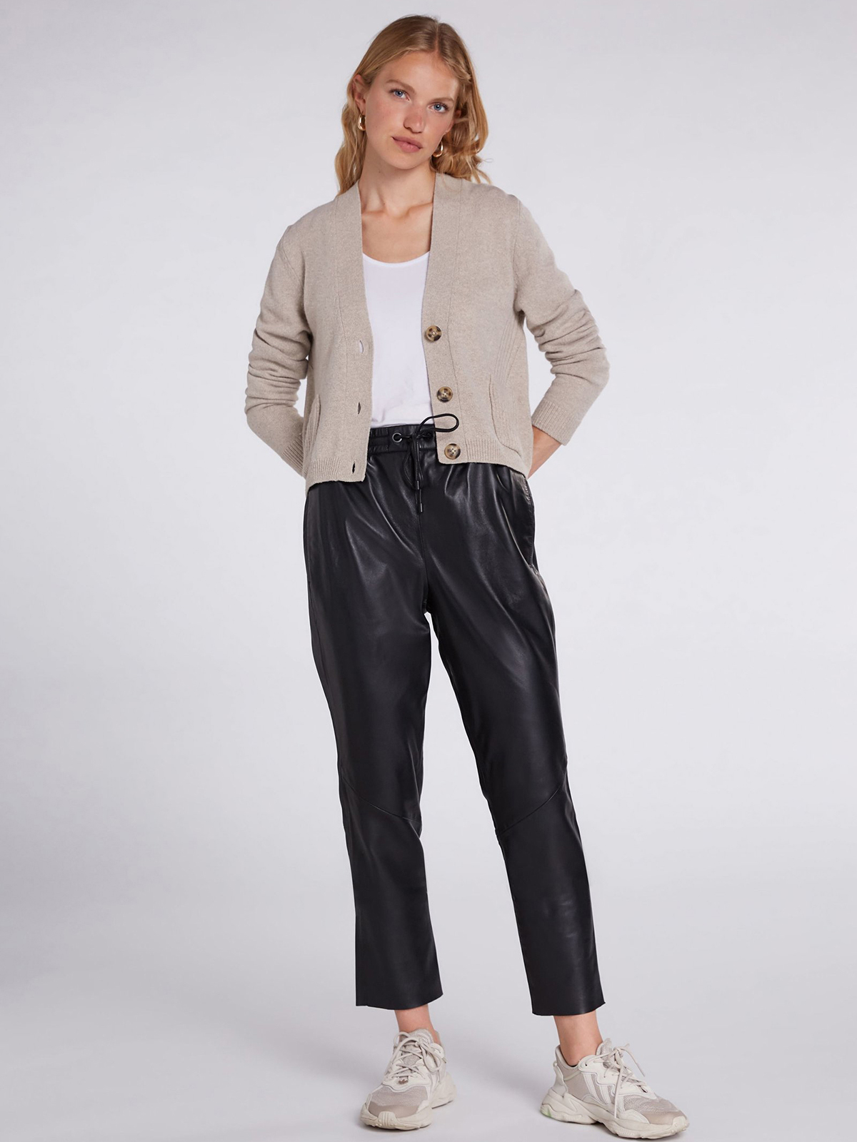 Укороченный кардиган с деталями в рубчик. Женственный V-образный вырез, планка с тремя пуговицами. Два практичных накладных кармана. Длинные втачные рукава. Длина 50 см для размера 42. Рост модели 178 см, ее размер – 42 (российский).