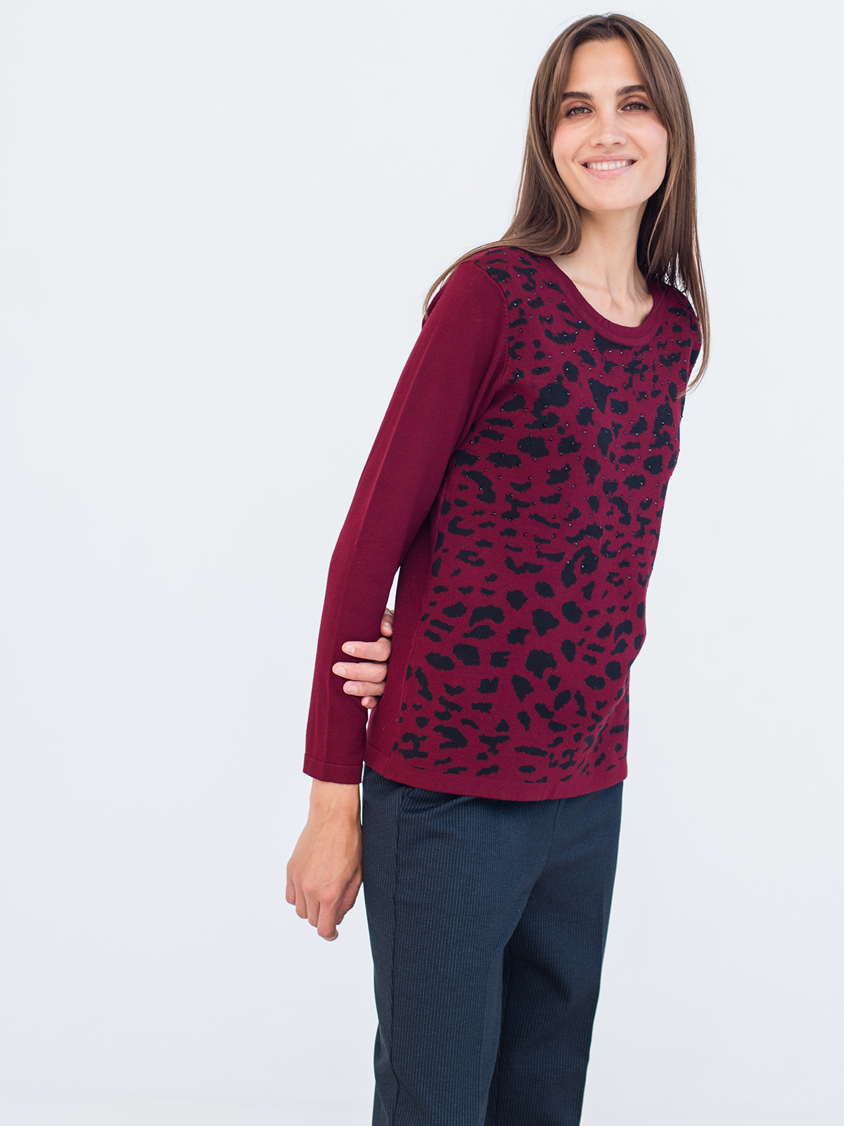 На сайте указаны Российские размеры. Анималистичный принт – бесспорный тренд этого сезона! Джемпер в насыщенном бордовом оттенке с леопардовым узором украшен стразами. Овальный вырез горловины подчеркивает изящество линии шеи. Прямой крой прекрасно подходит к разному типу фигуры. Джемпер хорошо сочетается как с брюками, так и с юбкой.