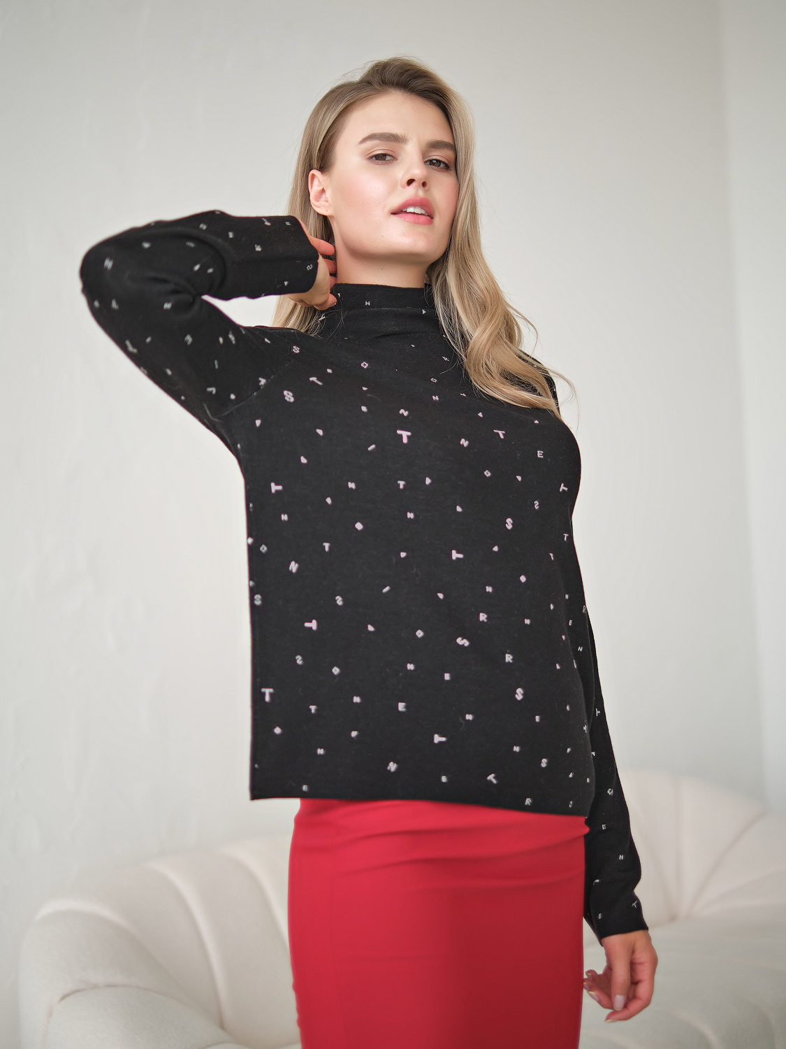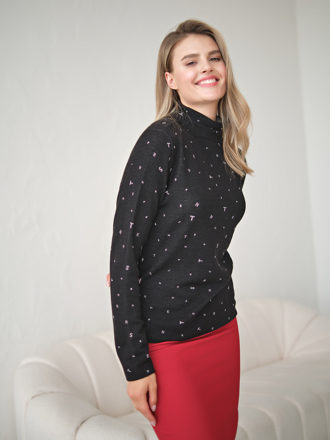 Базовая черная водолаза с текстовым узором по всей поверхности. Воротник-гольф, длинный втачной рукав. Полуприталенный силуэт подчеркивает фигуру. Джемпер может выступать в качестве самостоятельного верха или надеваться под жакет или блейзер.