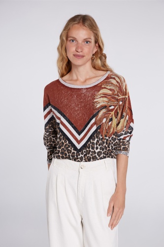 Джемпер свободного силуэта с анималистичным дизайном. Широкий овальный вырез горловины, спущенная линия плеч. Длина 62 см для 42 российского размера. Рост модели 178 см, ее размер - 42.