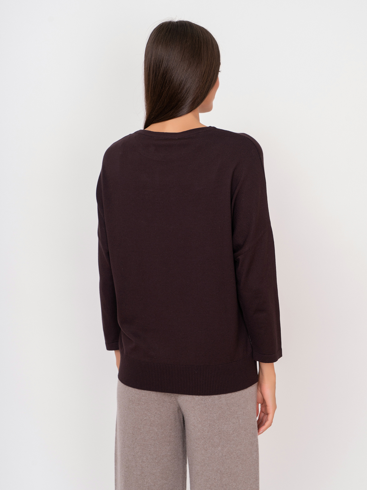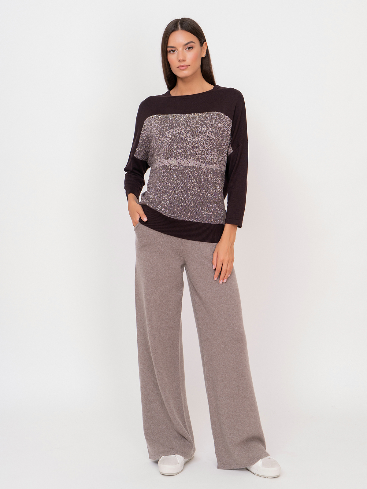 Джемпер с нитью люрекса подойдет для повседневного городского образа. Рукав 3/4, спущенная линия плеч, круглый вырез горловины.