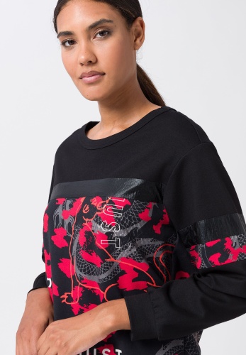 Черный свитшот с ярким принтом. Широкий овальный вырез горловины, длинный втачной рукав, спущенная линия плеч. По низу эластичный пояс с кулиской.