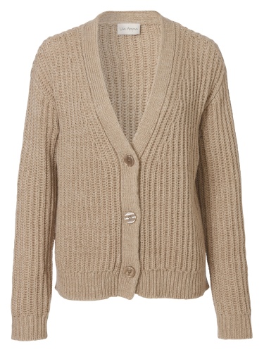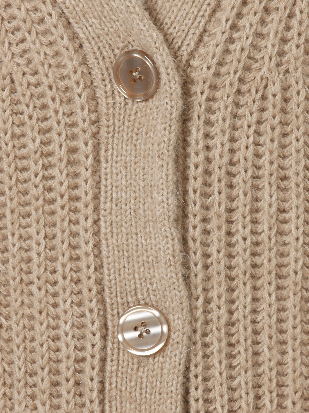 Базовый однотонный кардиган с v-образным вырезом горловины. Длинный втачной рукав, спущенная линия плеч. Планка с пуговицами в тон изделия.