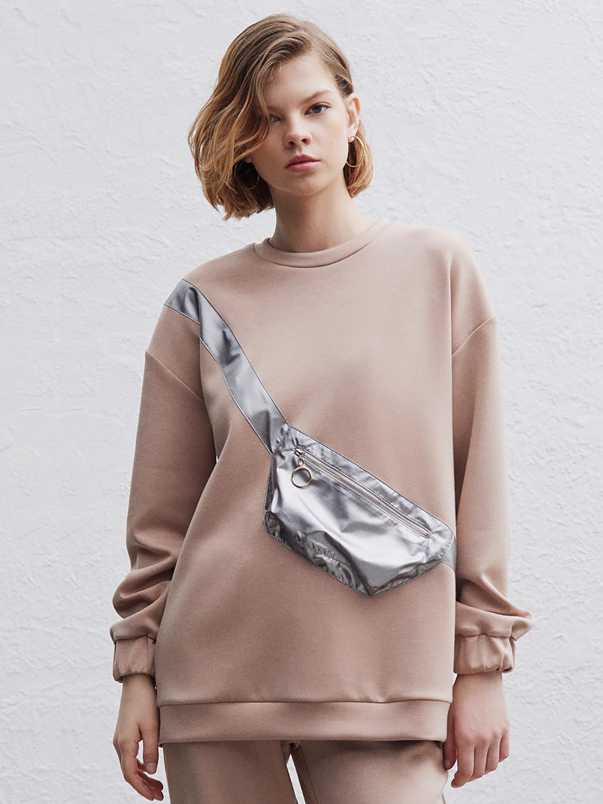 Свитшот прямого кроя с накладным карманом, стилизованным под поясную сумку. Руглый вырез горловины, длинные рукава с манжетами, спущенная линия плеч.