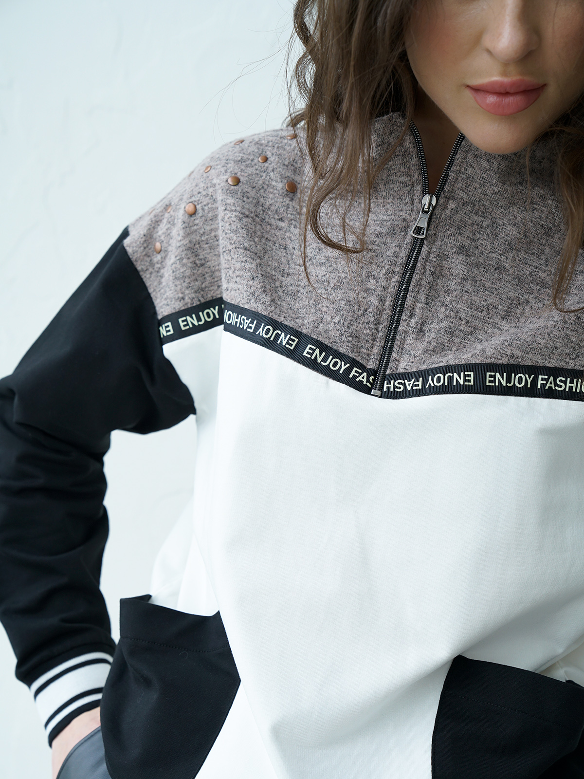 Джемпер в спортивном стиле выполнен из смесового хлопка. Высокий воротник-стойка на молнии, свободный силуэт, спущенная линия плеч. Длинные втачные рукава с эластичными манжетами. Контрастные накладные карманы.