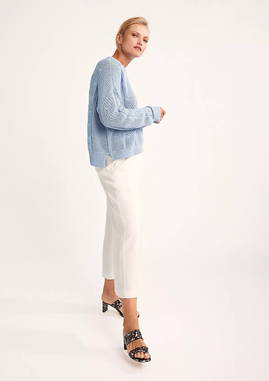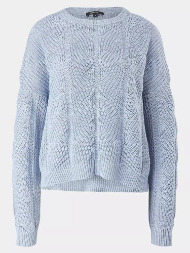 Однотонный джемпер крупной вязки. Материал из натурального хлопка. Свободный силуэт, спущенная линия плеч. Круглый вырез горловины, длинные втачные рукава.