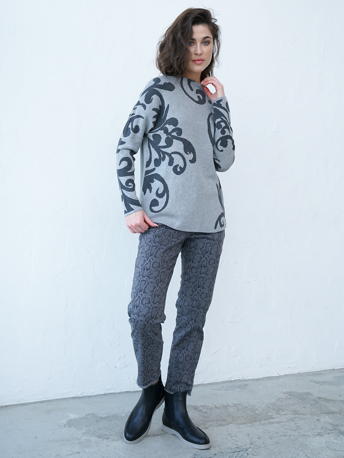 Джемпер прямого кроя с ажурным узором. Вырез горловины лодочка, втачные рукава, спущенная линия плеча.