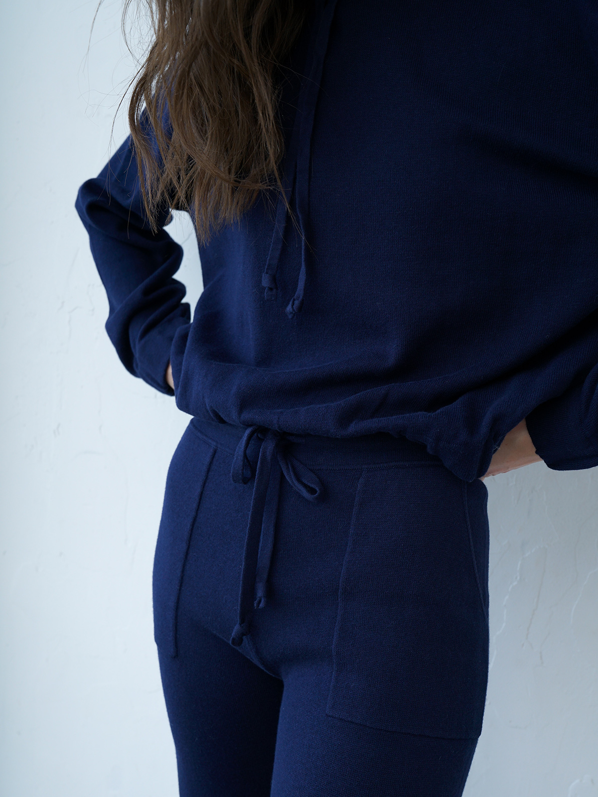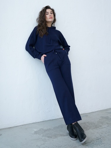 Однотонная толстовка в насыщенно-чернильном оттенке. Капюшон на кулиске, длинные втачные рукава с манжетами.