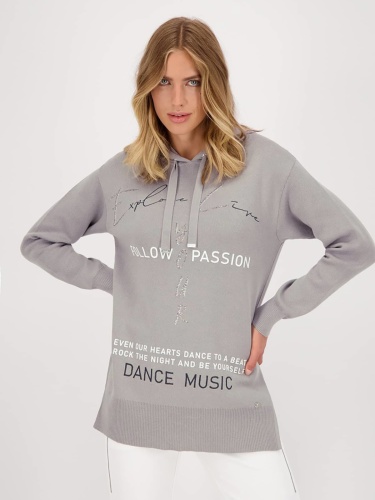 Однотонная толстовка прямого кроя в сером оттенке с принтом. Капюшон с кулиской и шнурком в тон изделия. Спущенная линия плеч, длинные втачные рукава с трикотажными эластичными манжетами. Широкая резинка в рубчик по низу изделия.