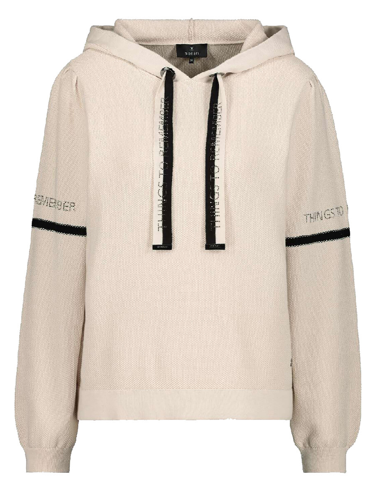 Однотонная толстовка прямого кроя в базовом бежевом оттенке. Капюшон с кулиской и контрастным шнурком. Длинные втачные рукава с трикотажными эластичными манжетами. Акцентные детали в виде контрастных полос на рукавах.