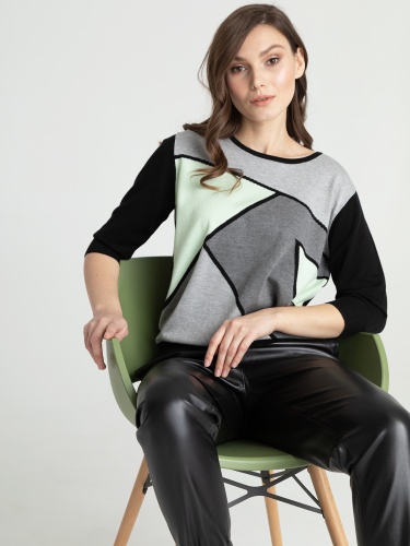 Джемпер в стиле пэчворк. Базовая цветовая гамма, прямой силуэт. Однотонные черные рукава длиной 3/4. Овальный вырез горловины обрамлен черной бейкой.