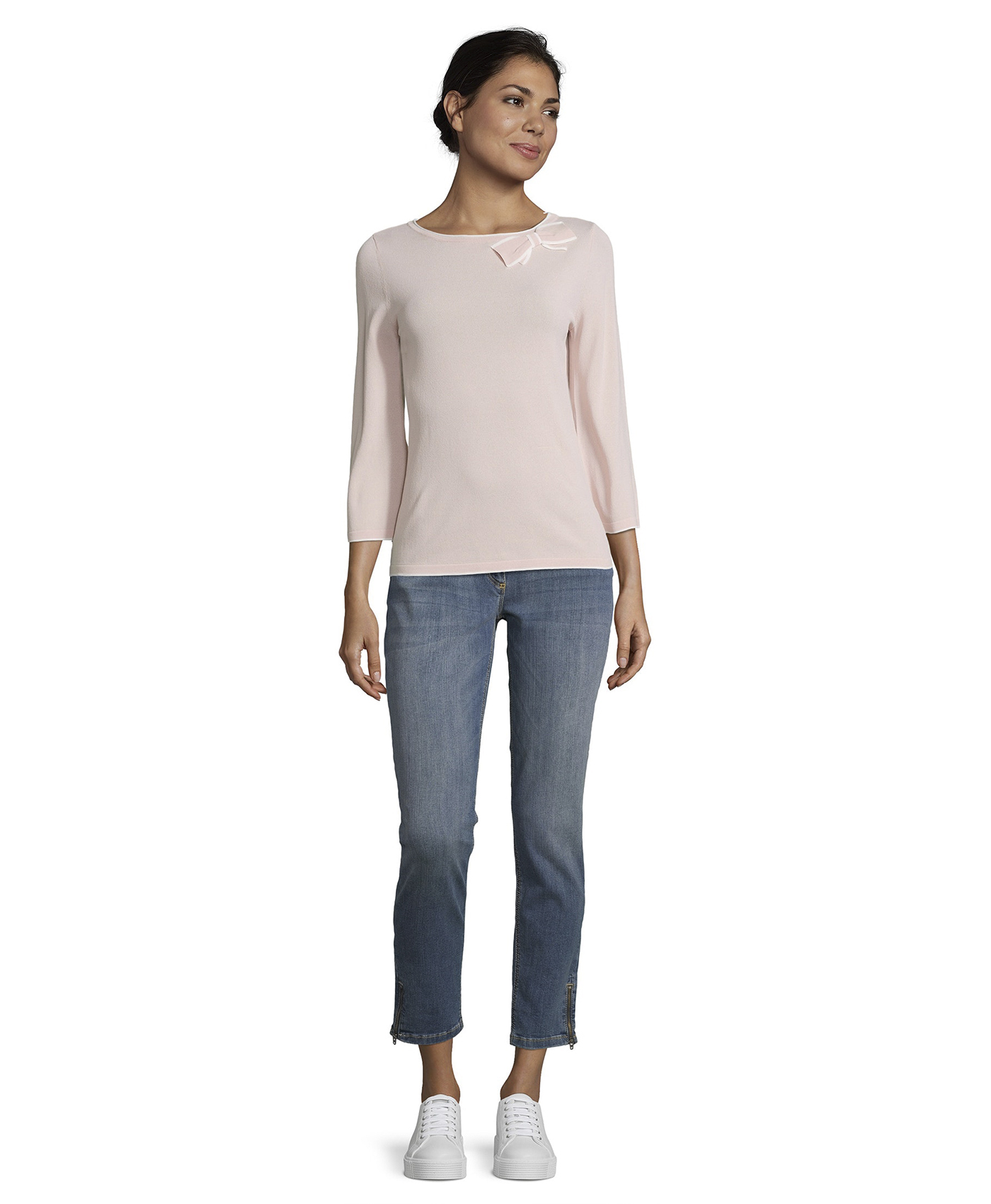 Однотонный джемпер - современная классика! Слегка приталенный силуэт джемпера подчеркивает достоинства фигуры. Вырез горловины "лодочка", рукава 3/4. Элегантная деталь дизайна - бант в области горловины. Материал из вискозной смеси приятен к телу и обеспечивает комфорт. Этот универсальный джемпер прекрасно смотрится как с брюками, так и с юбкой.