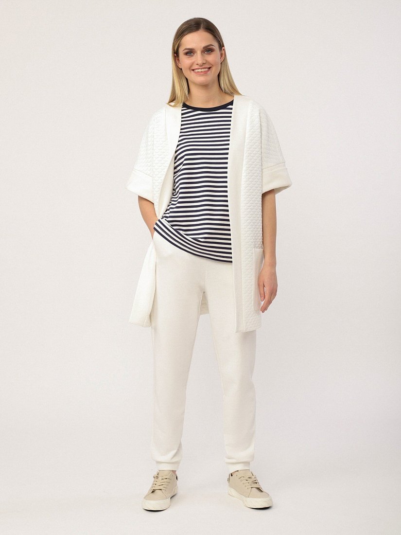 Жилет прямого силуэта из фактурного трикотажа для нежного образа. Акцент на талии за счет пояса в тон изделия. Укороченные рукава-кимоно с широким манжетом. По краю борта идет лента переходящая в горловину.
