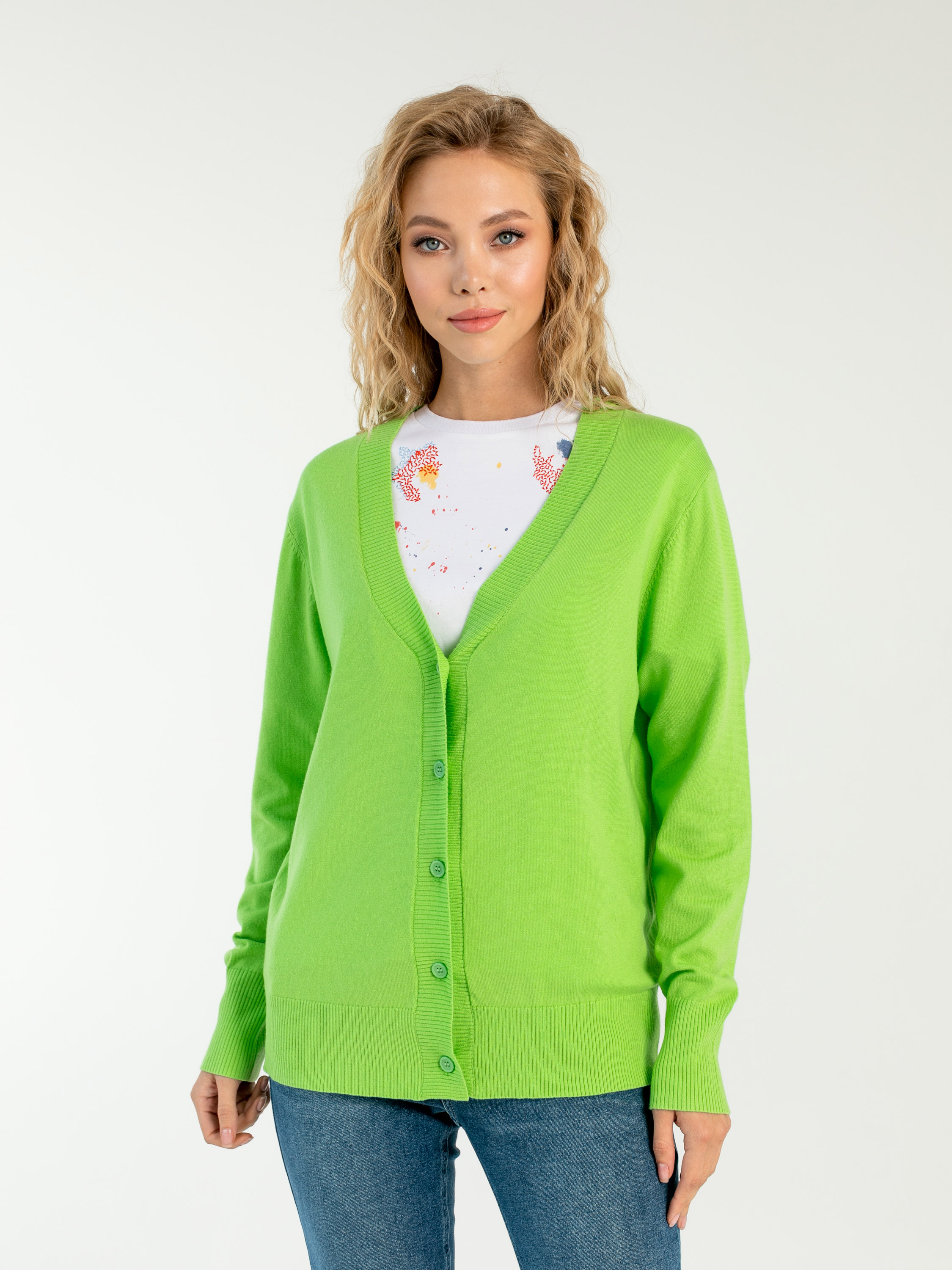 На сайте указаны Российские размеры. Кардиган яркого актуального цвета скроет все несовершенства фигуры и подчеркнёт достоинства. Модель свободного кроя с глубоким V-образным вырезом. На пуговицах. Рукав полной длины со спущенным плечом. Выбрав этот кардиган, можно с уверенностью сказать - вы в тренде. Ткань: выполнен из уютного, теплого и приятного материала – трикотажа с акрилом и хлопком. Крой: кардиган прямого кроя с красивым V-образным вырезом, подчеркивающим красоту шеи и зоны декольте. Может выступать самостоятельной деталью гардероба, так и компаньоном для водолазки, футболки, блузки и рубашки. Рукав с манжетом-резинкой позволяет регулировать длину, а еще согреет руки, если вы оставили дома перчатки. Вязка-резинка в нижней части надежно фиксирует кардиган на теле, не позволяя ему подниматься вверх при ходьбе и движении. Отделка: однотонный лаконичный кардиган сочного салатового цвета дополнен контрастными пуговицами. Рост модели - 177 см