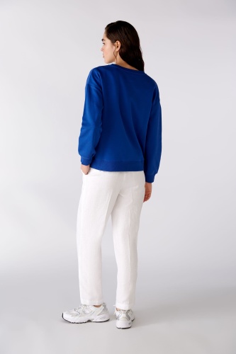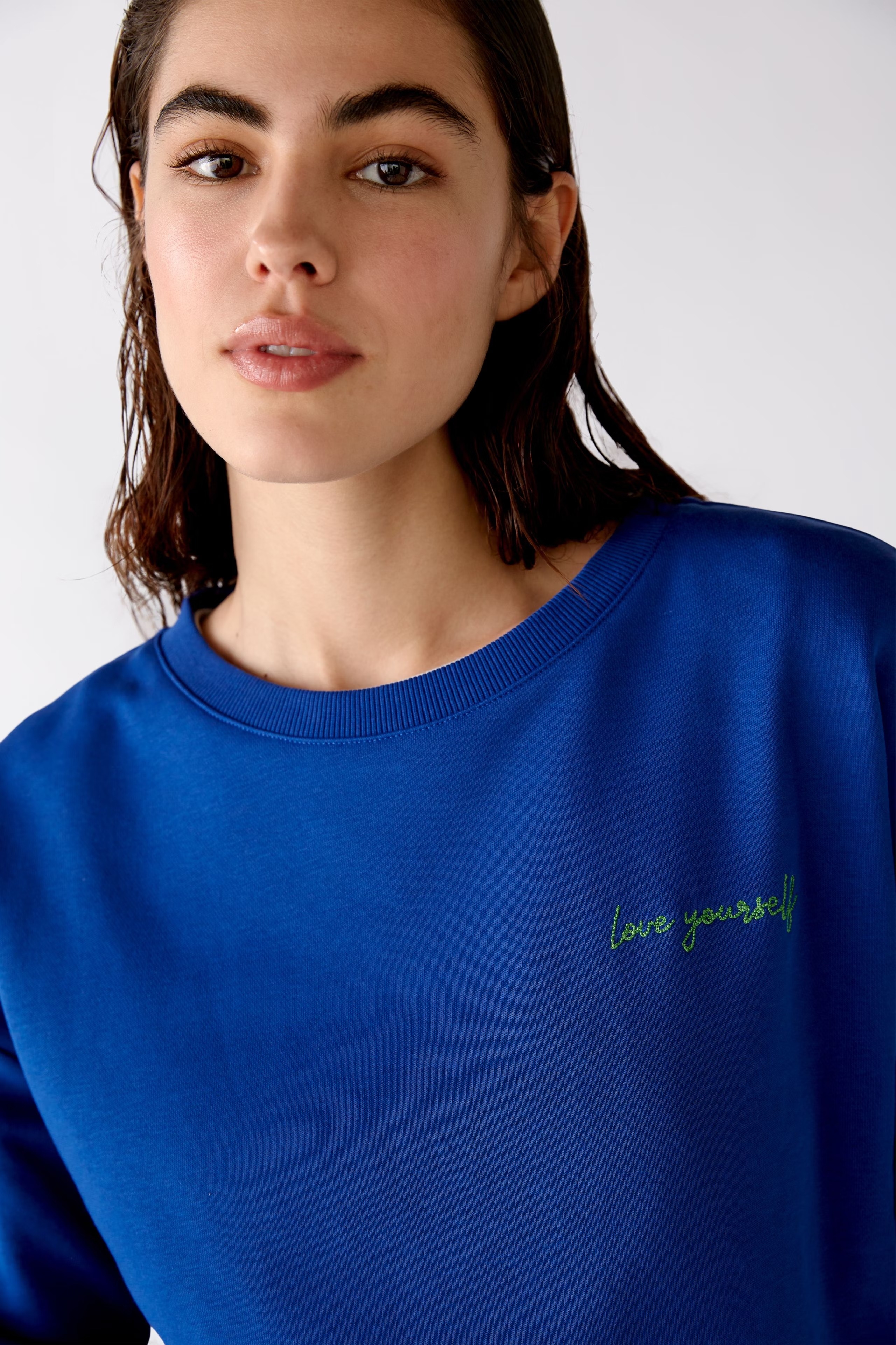 Немецкий бренд. На сайте указаны Российские размеры. Повседневная толстовка со спущенными плечами. Спортивные ребристые манжеты на рукавах, кромке и вырезе горловины. Вышивка "люби себя" на левой стороне груди. Круглый вырез спортивного кроя. Модель отлично сочетается с шортами OUI (арт.76362)