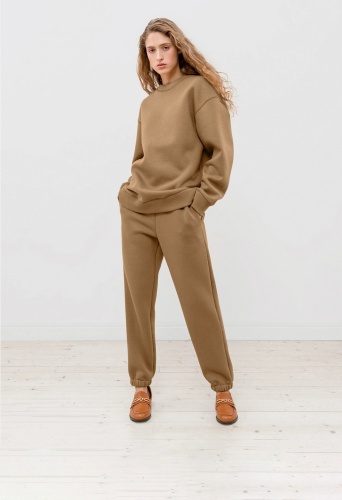 На сайте указаны российские размеры. Свитшот женский прямого силуэта из трикотажного полотна орехового цвета с круглым вырезом горловины, спущенным плечом и рукавом полной длины. Вырез горловины, низ рукавов и низ изделия обработаны кашкорсе в цвет основной ткани. Рост модели на фото - 175 см.