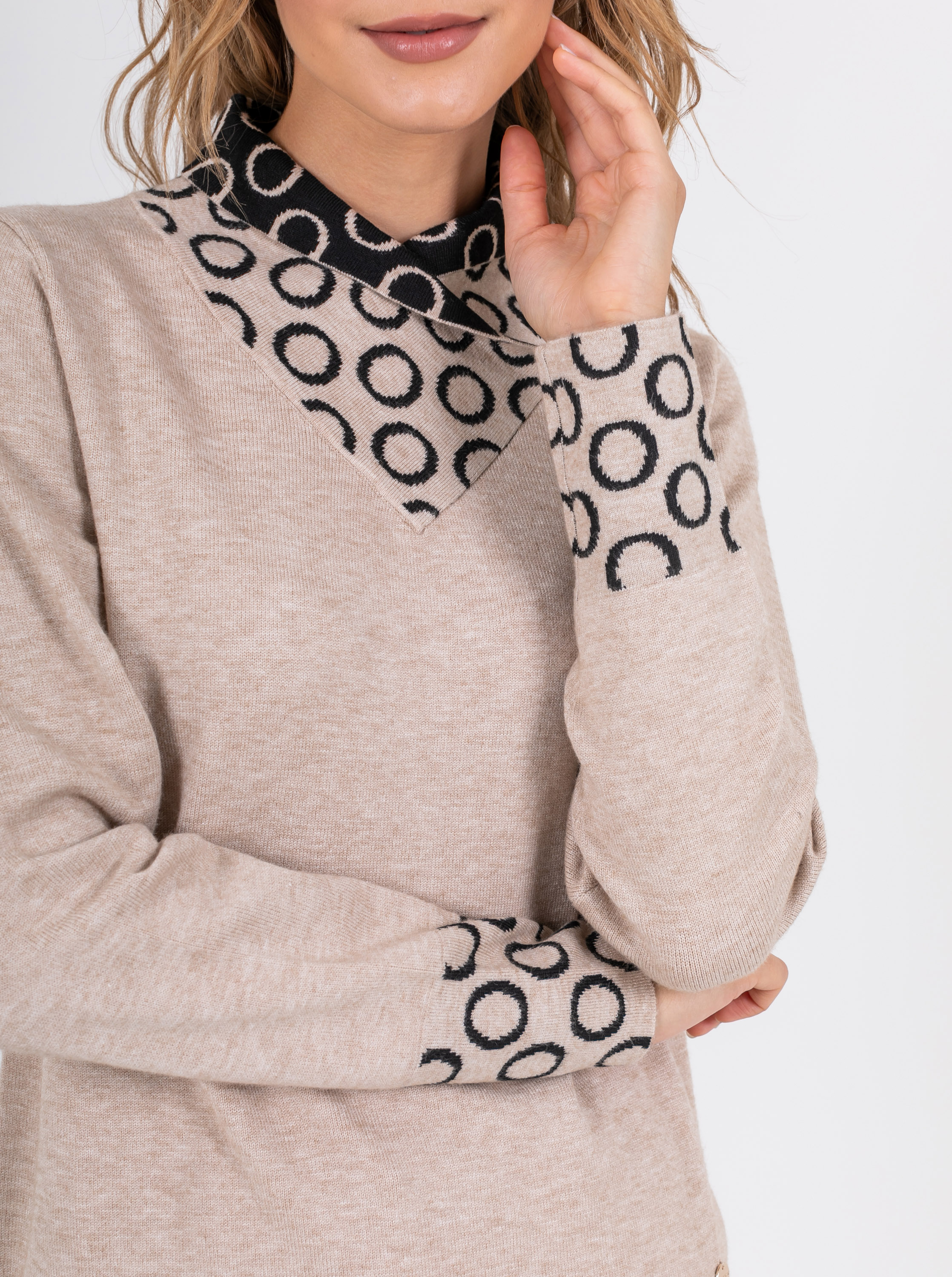 На сайте указаны российские размеры. Ткань: выполнен из качественного гладкого трикотажа. В составе 6% шерсть,10% нейлон, 59% полиэстер, 10% вискоза. Крой: слегка приталенный джемпер из гладкого трикотажа средней плотности. Женственная, подчеркивающая все достоинства фигуры модель создает гармоничный и спокойный образ, который захотят повторить. Оригинальный ворот выделяется своей необычной конструкцией и подчеркивает красоту шеи. Длинные, чуть свободные рукава с манжетом-резинкой, не сковывают движения, дарят комфорт и тело. Джемпер представлен в двух стильных цветах – черном и бежевом. Отделка: двусторонний ворот, сложенный изящным уголком, поражает воображение: контраст двух цветов, усиленный узором «круги», делает образ запоминающимся и на 100% стильным. Цветовое решение поддерживают и рукава с тем же принтом. Сочетайте с однотонными вещами из коллекции Stern, чтобы не смещать фокус внимания с красивой отделки джемпера. Рост модели: 174 см Длина по спинке: 60 см