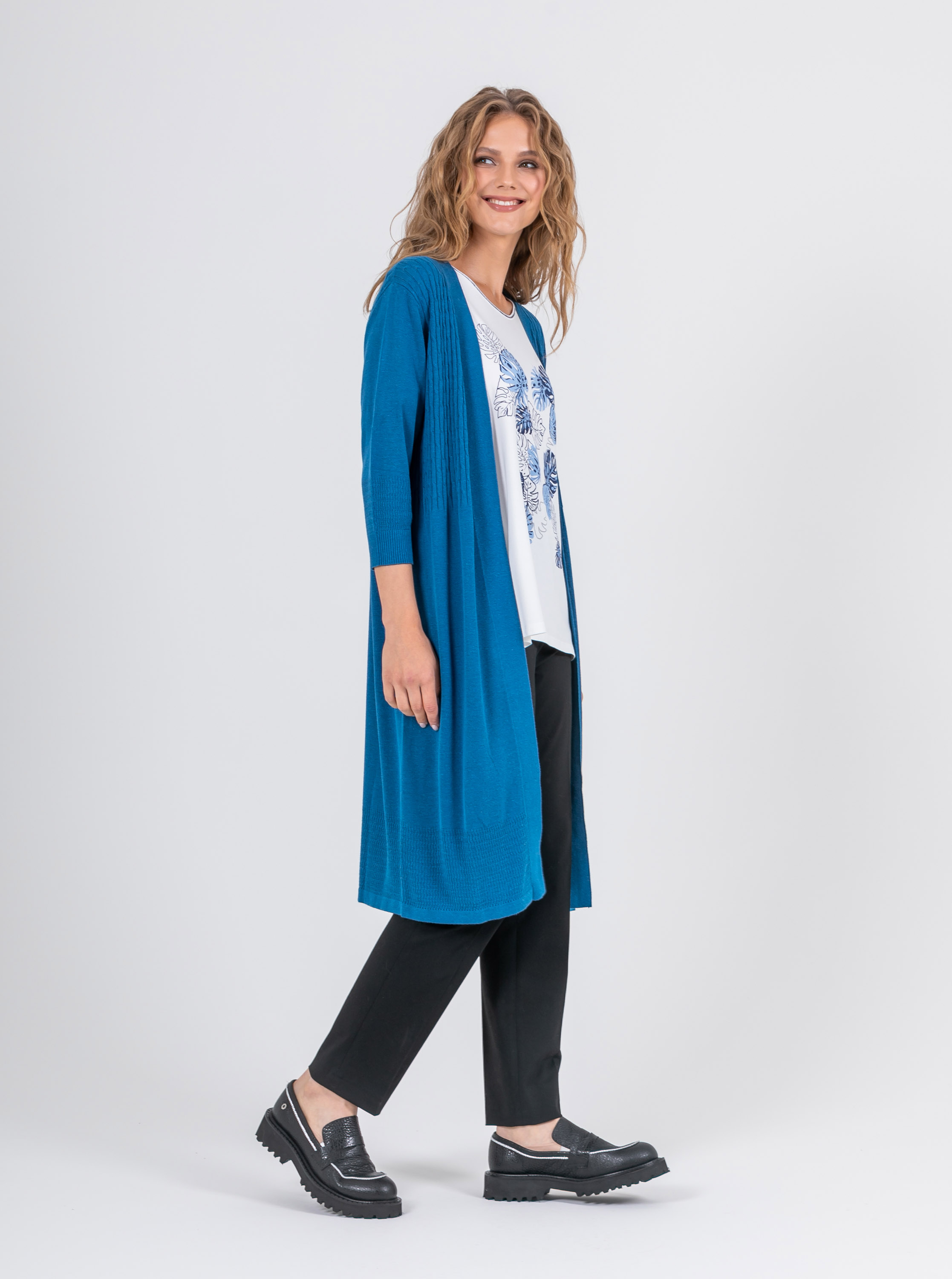 На сайте указаны российские размеры. Ткань: кардиган из мягкой, приятной телу вискозы с добавлением льна. Материал позволяет создавать красивую драпировку. Крой: прямой удлиненный кардиган с рукавом 3/4 создает идеальную вертикаль, визуально удлиняющую силуэт. Функциональный манжет-резинка позволяет поднять и зафиксировать рукав на нужном уровне. Отделка: кардиган имеет два вида отделки – фактуру «косы» в верхней части и на спинке и фактуру «волна» в нижней части изделия. В верхней части спины присутствует фирменный металлический шильдик-эмблема. Кардиган отлично дополняет футболки, рубашки, блузки, а также брюки, юбки и платья из ассортимента Stern. Рост модели 175 см.
