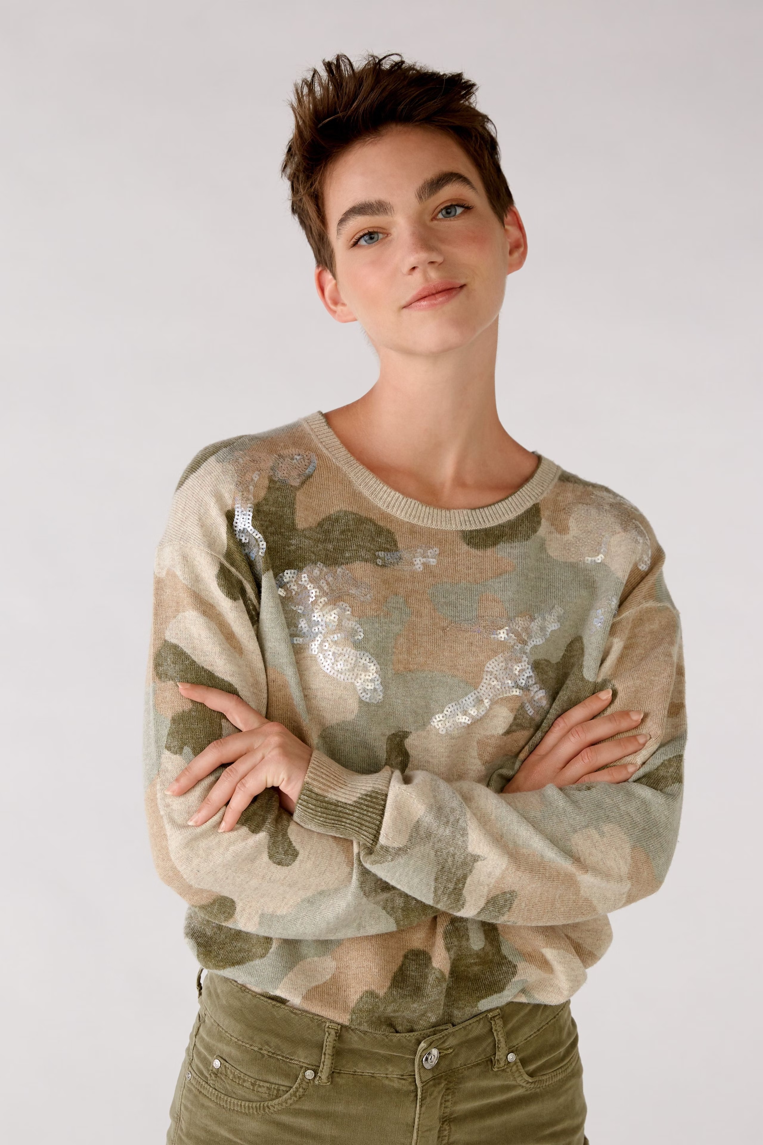 На сайте указаны российские размеры. Пуловер прямого покроя. Стразы, сужающиеся от плеча к талии. Декоративная строчка на плече яркого цвета. Ребристый низ, рукава и воротник. Рост модели 178 см.