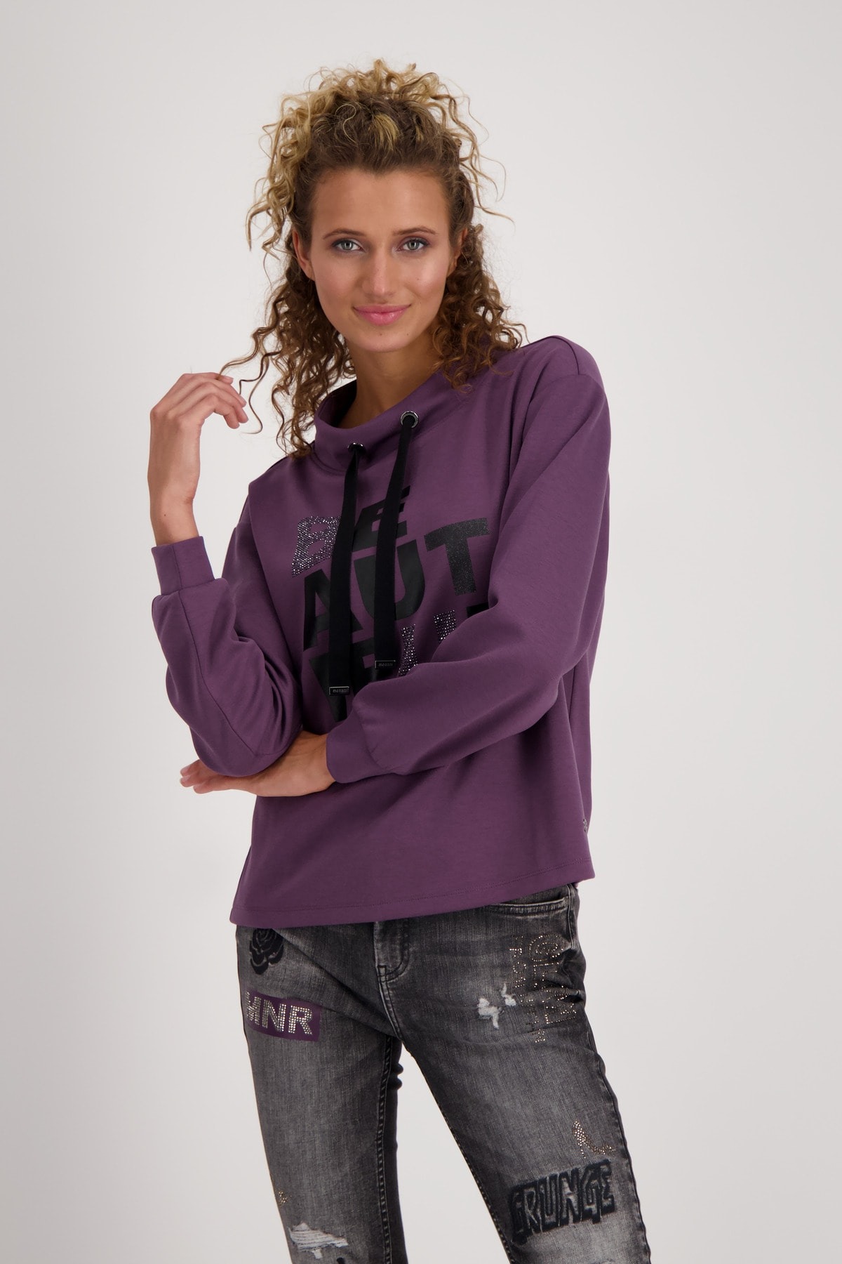 На сайте указаны российские размеры. Толстовка с длинными рукавами, воротником-стойкой и стразами. Удобная посадка обещается благодаря прямому крою с воротником-стойкой, широким манжетам на концах рукавов и слегка завышенным плечам. Надпись из глиттера, сверкающих стразов и блестящего лакового принта стала изюминкой довольно простой во всем остальном рубашки. Модель ростом 176 см