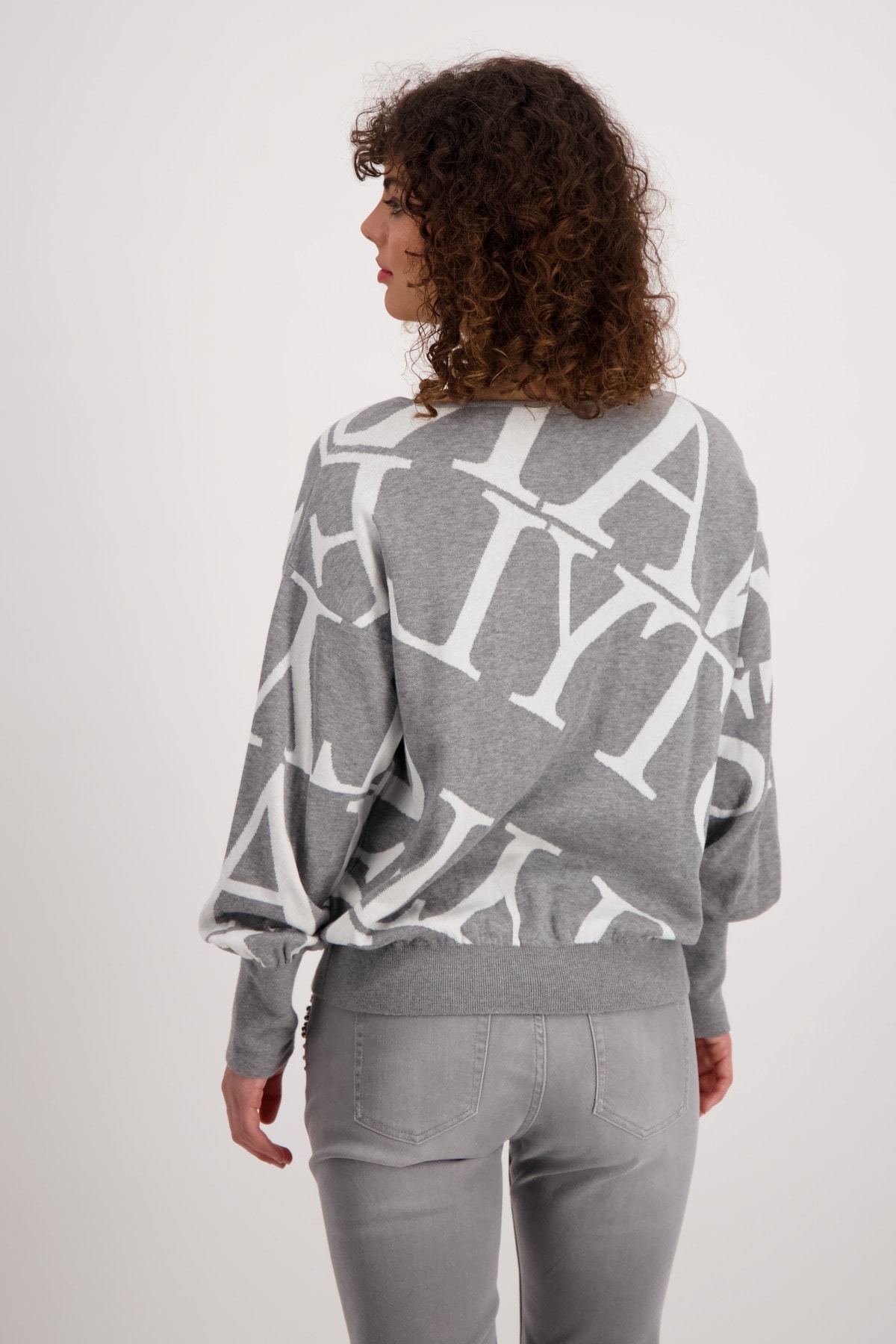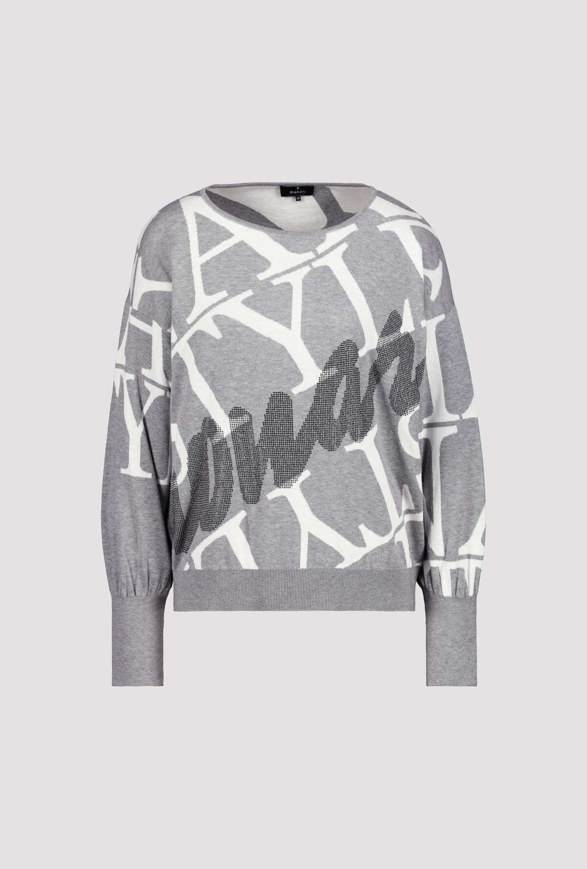 На сайте указаны российские размеры. Пуловер прямого кроя с круглым вырезом, широкой резинкой по низу и приятного качества из высококачественной смеси хлопка и полиамида для удобной посадки. Сплошной жаккард с надписями прерывается крупной надписью из страз в тон спереди и становится изюминкой дизайна. С гламурными джинсами облегающего кроя с драгоценными камнями для повседневного образа. Модель ростом 174 см.