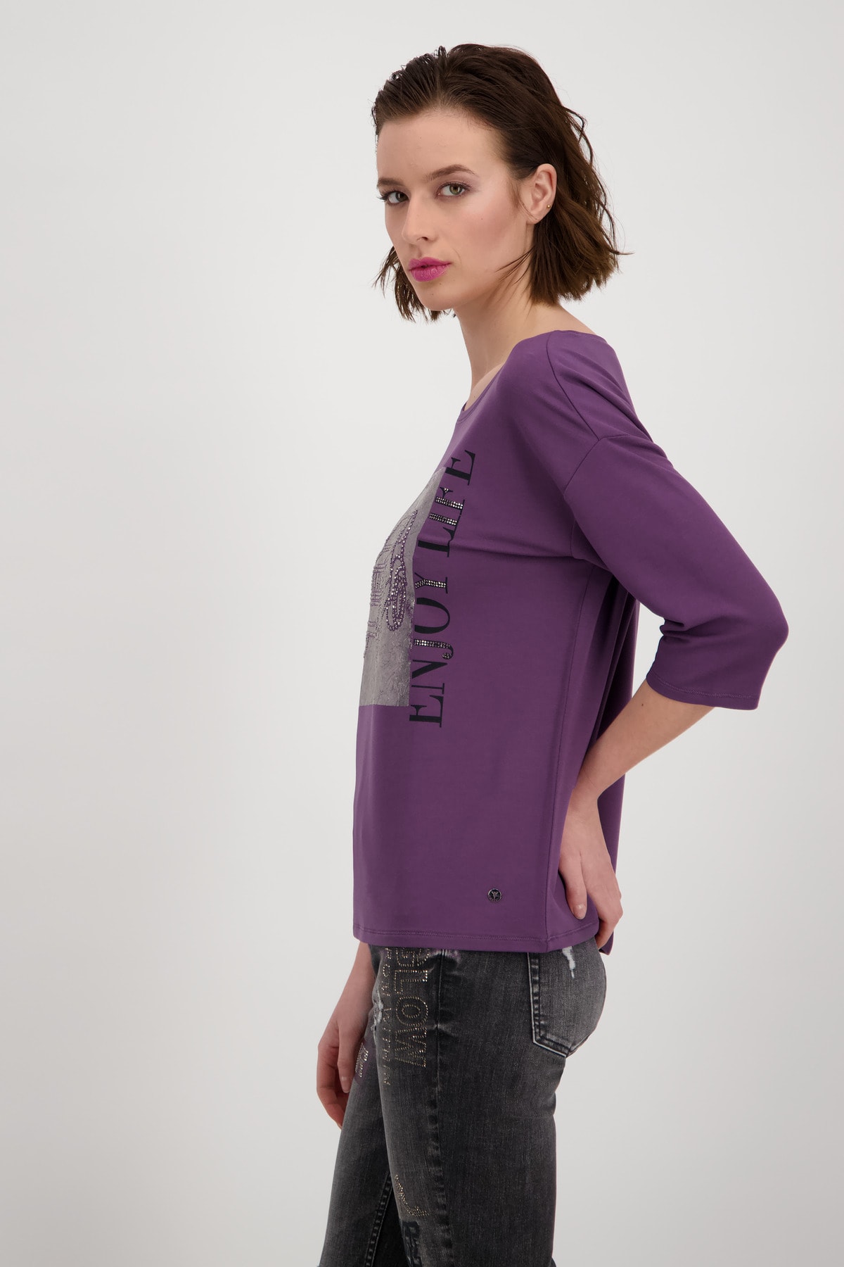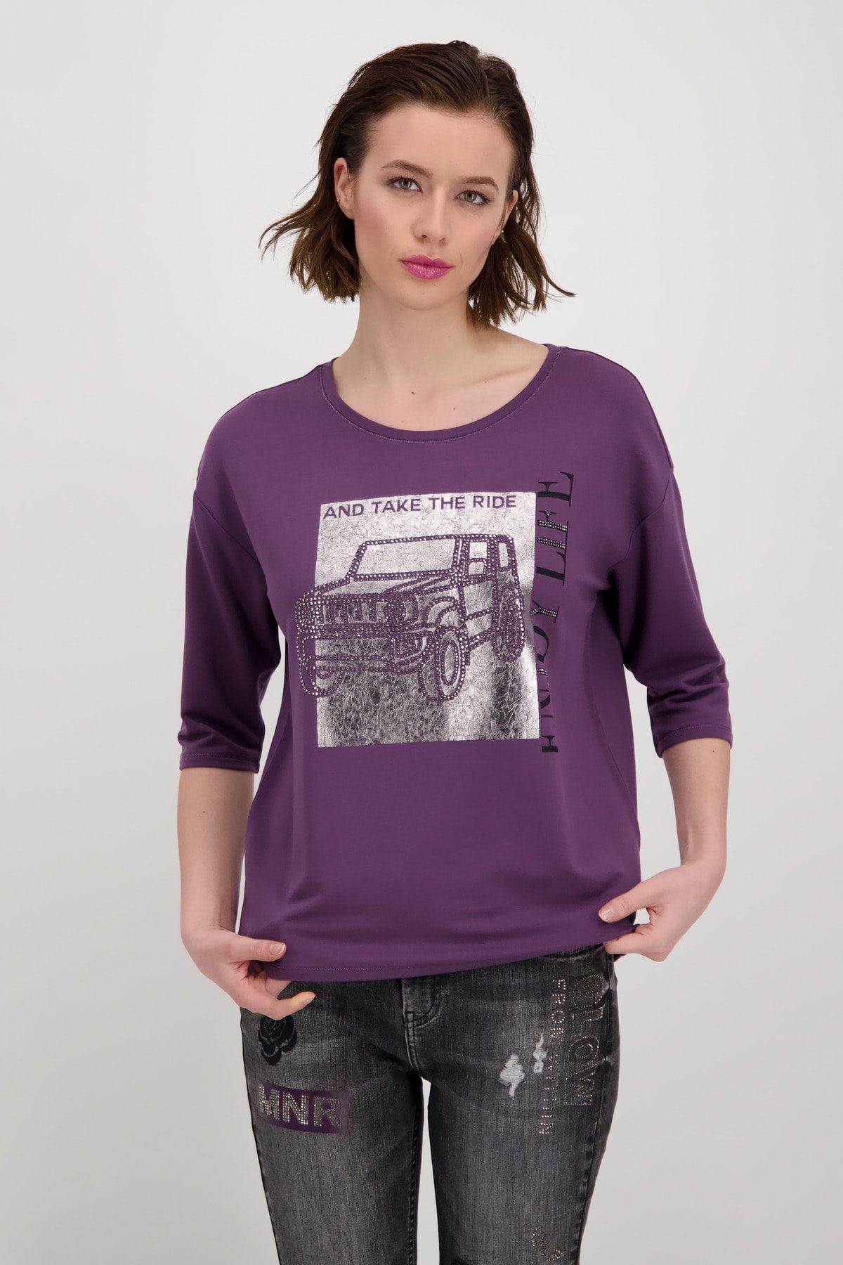 На сайте указаны российские размеры. Эта рубашка с рукавом ¾ от monari станет экстравагантной изюминкой вашего гардероба и обещает приятный и уютный комфорт благодаря обработке из струящейся вискозы, мягкого модала и небольшого количества эластана. Лакированная машина с окантовкой из сверкающих страз и надписями подчеркивает гламурный вид модели. Круглый вырез, концы рукавов и прямой низ с блестящим люрексом идеально дополняют образ. Будьте уверены в этой рубашке на каждой вечеринке или в повседневной жизни! Модель ростом 179 см. Длина спины 44 размера составляет 62 см.