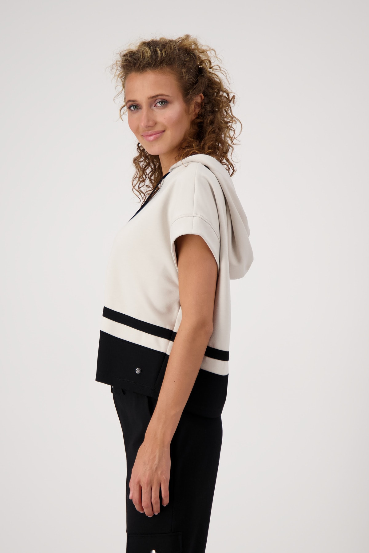 На сайте указаны российские размеры. Толстовка с капюшоном в стиле колор-блок. Комбинезон прямого кроя, капюшон с разделительным швом, кулиской, люверсами в виде колец и завязкой со сверкающими стразами, а также намеком на короткий рукав внахлест. Концы рукавов дополнены широкими манжетами. Модель ростом 176 см.