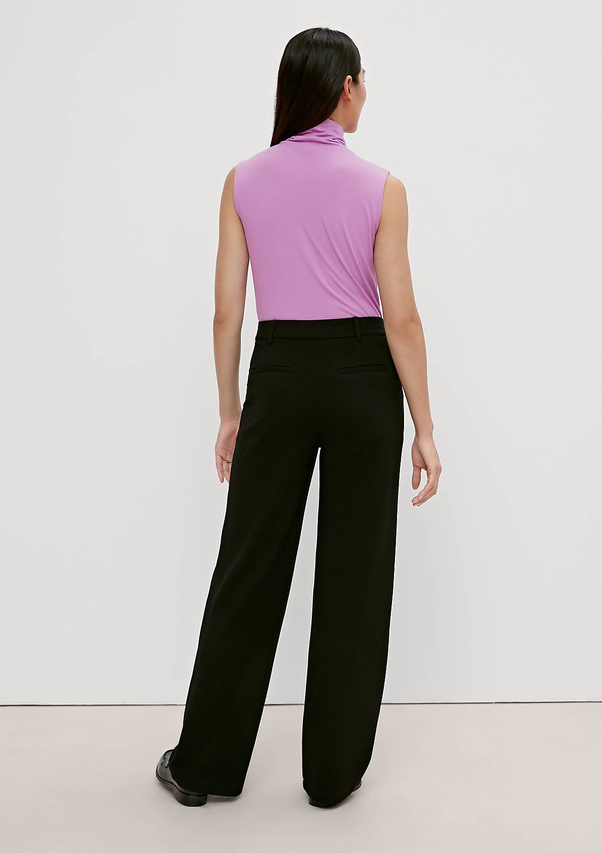 На сайте указаны российские размеры. Приталенный топ без рукавов с воротником-поло. Выполнен из эластичной мягкой ткани. Длина спины: 60 см в размере 42.