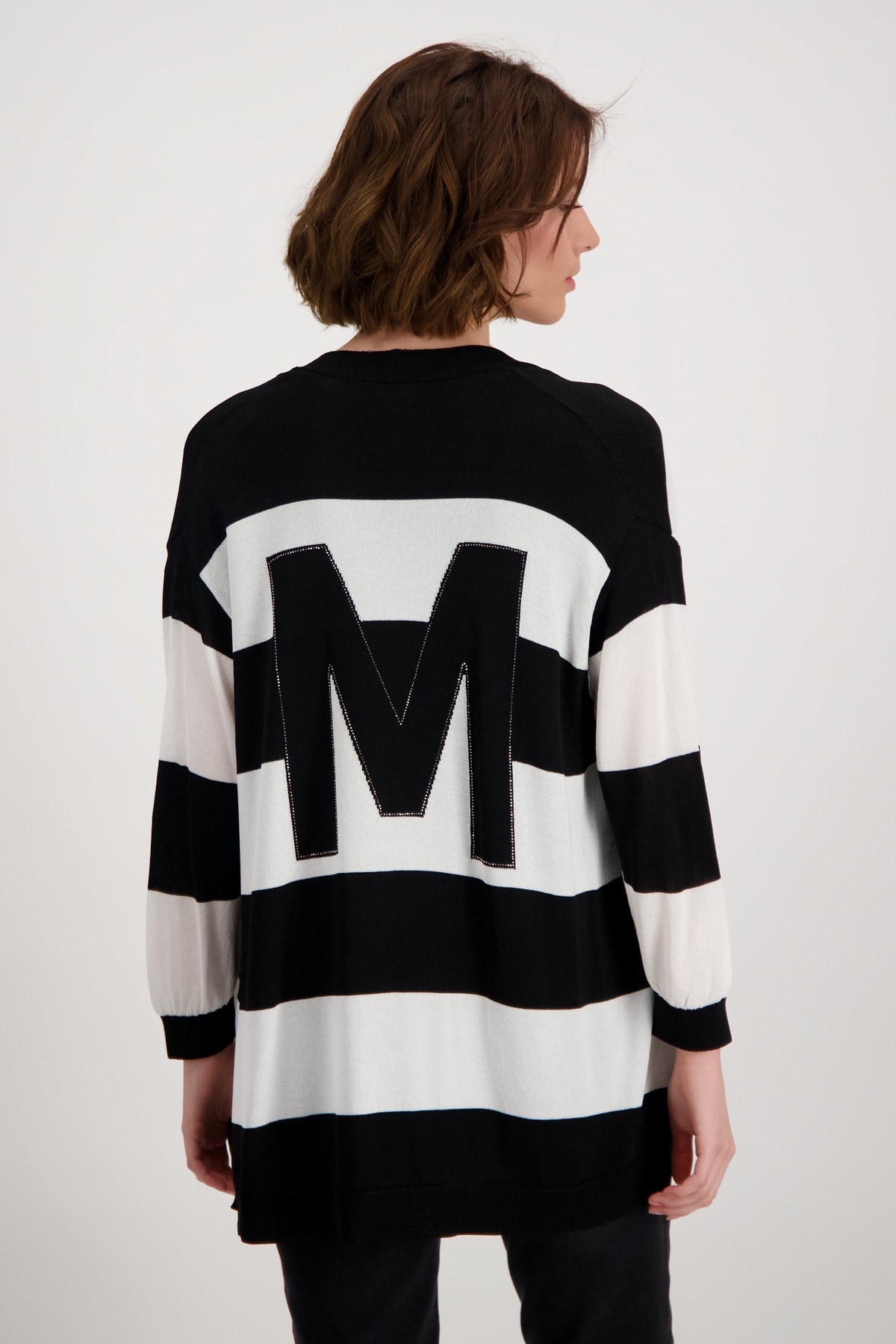 На сайте указаны российские размеры. Открытый кардиган с рукавом 3/4 и деталью на спине. Кардиган с открытым передом придает вашему образу великолепный вид и идеально подходит для комбинирования. Прямой фасон дополнен манжетами и рюшами на концах рукавов, боковыми разрезами и низом с манжетами в резинку. Вывязанная буква со сверкающими стразами украшает спину модели, украшенной полосками по всей поверхности. Струящаяся вискоза в смеси также обеспечивает удобную посадку. Побалуйте себя. Модель ростом 178 см Длина спины 72 см.