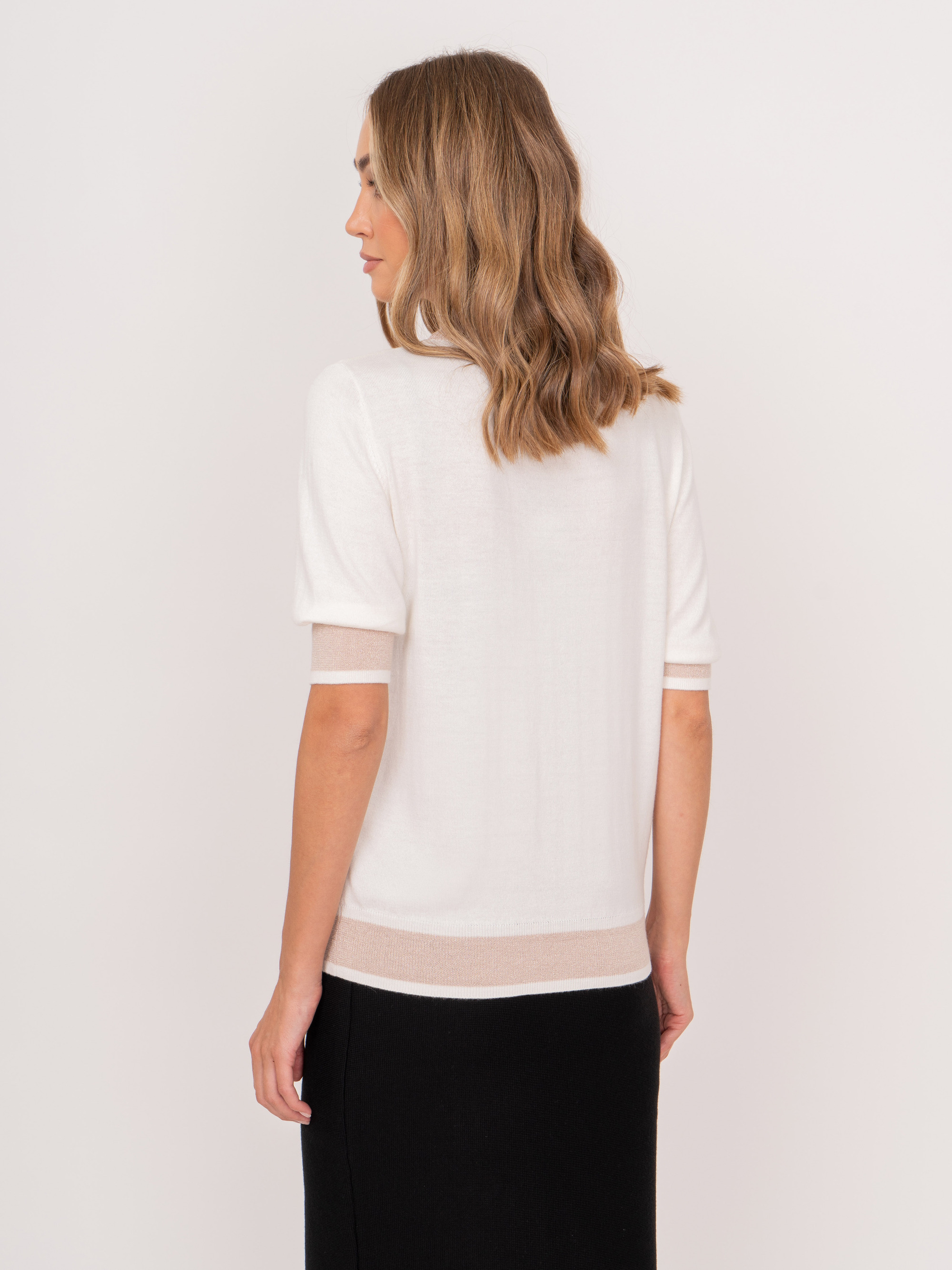 На сайте указаны российские размеры. Трикотажный полуприлегающий джемпер с воротником воронка, с коротким 1/2 рукавом, с бежевыми вставками. Представлен в молочном и черном цветах. Рост модели: 175 см. Длина джемпер: 57 см.