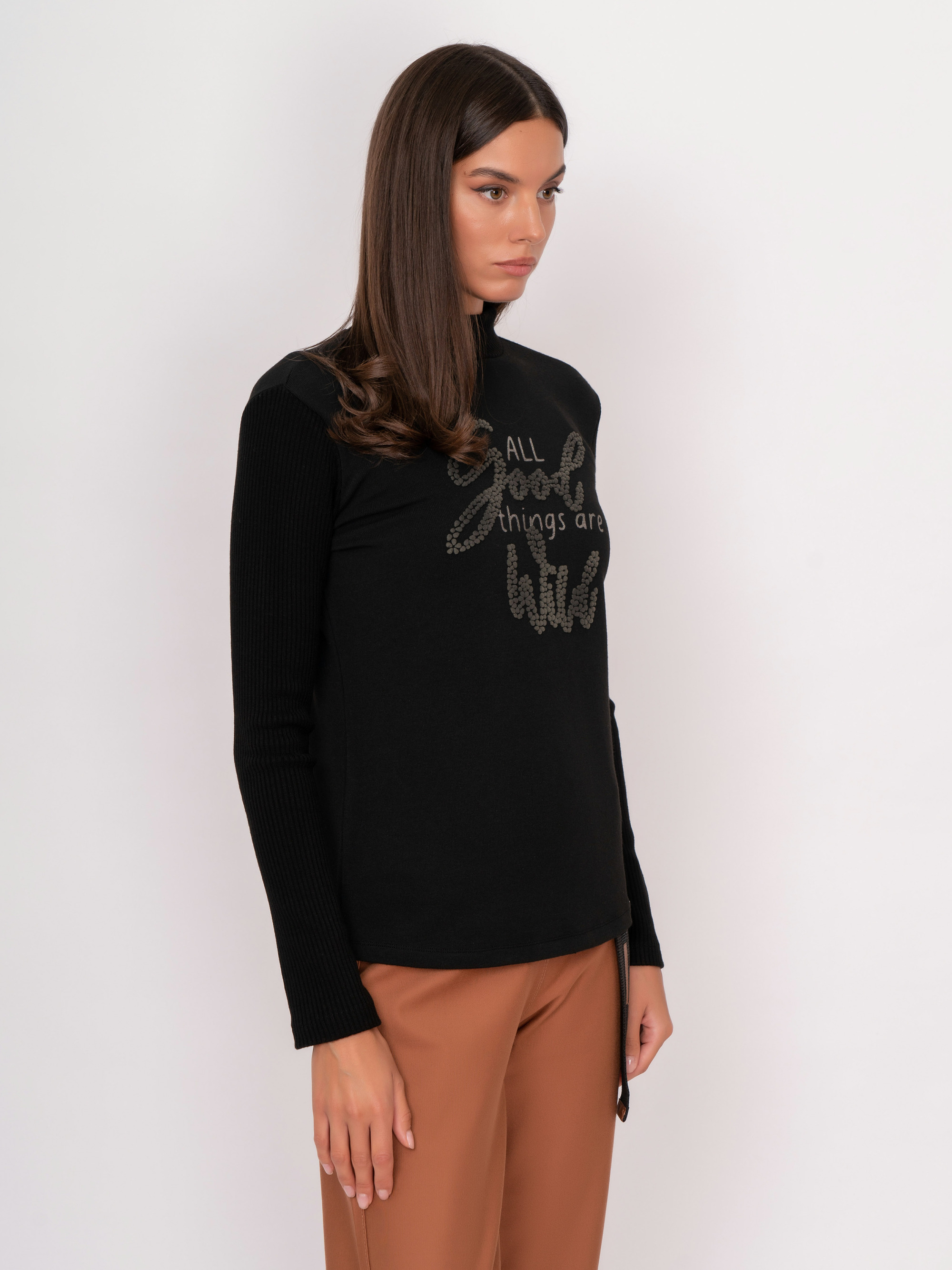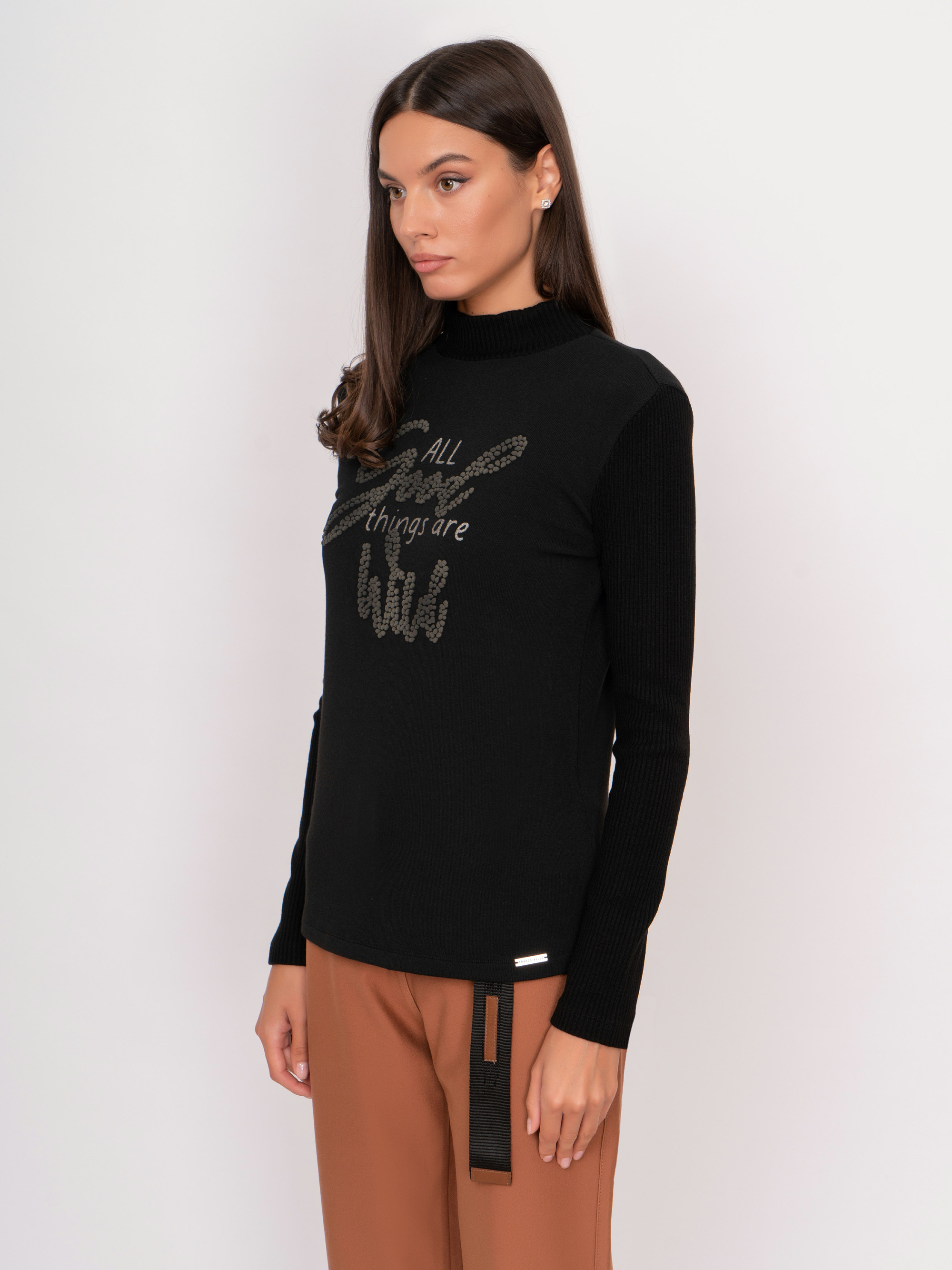 На сайте указаны российские размеры. Полуприлегающий трикотажный черный вязаный свитер с воротником-воронка, с длинным рукавом, с серыми фактурными надписями. Рост модели: 175 см. Длина джемпера: 56 см.