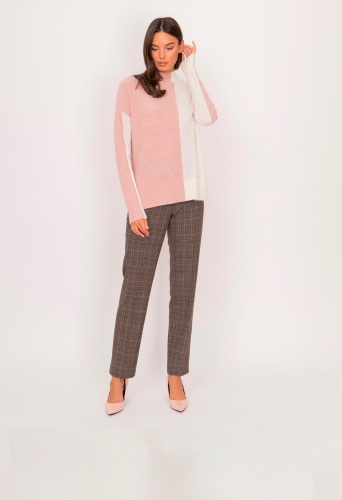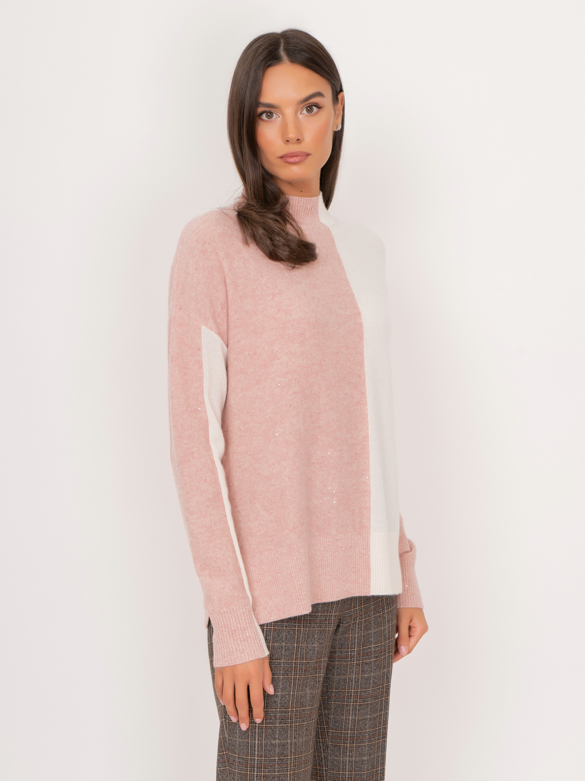 На сайте указаны российские размеры. Прямой шерстяной бело-розовый свитер с воротником воронка, с длинным рукавом, с боковыми разрезами, с паетками. Рост модели: 175 см. Длина джемпера: 61 см.